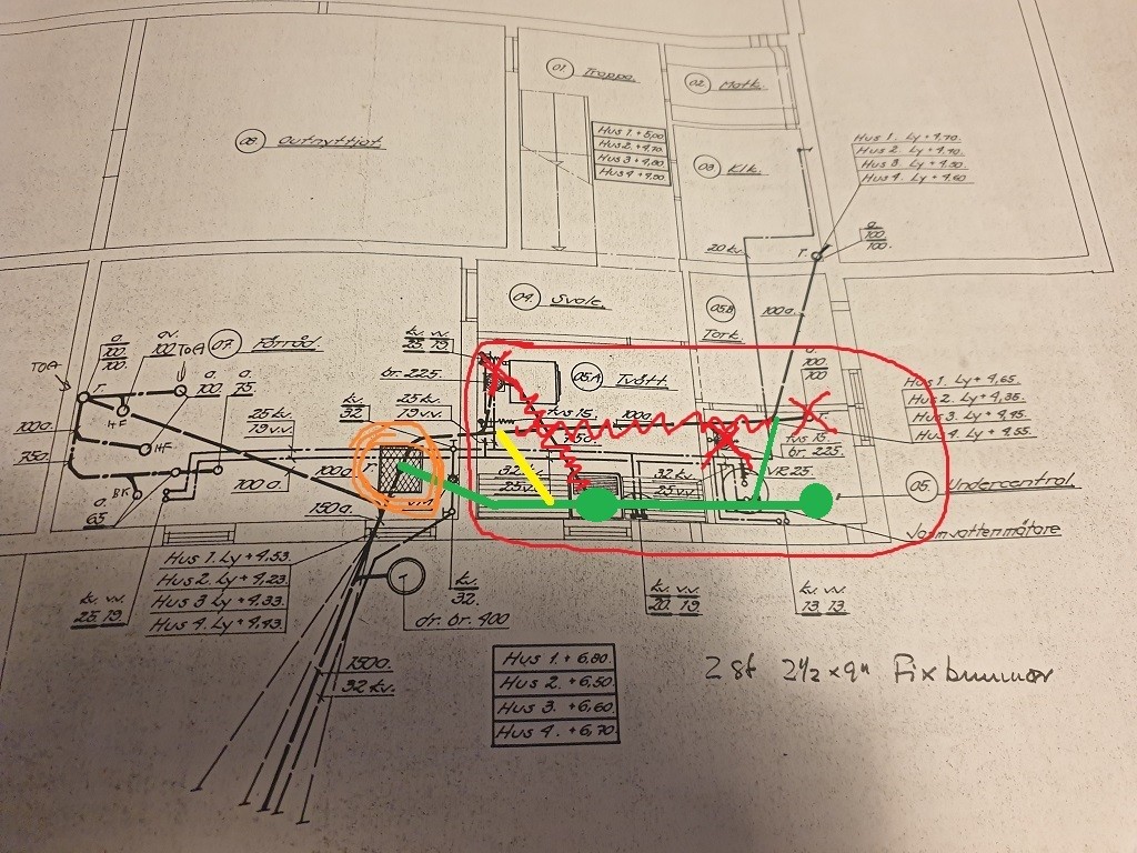 Frågan är om jag kan dra det sådär och koppla på det på stammen där dagens rensbrunn är, den orangea inringade? Denna rensbrunn vill jag ta bort då den är en gigantisk plåtlåda på 50x80cm och istället lägga in en rensbrunn på den nya stammen som jag lägger ner, det borde väl inte vara några problem?