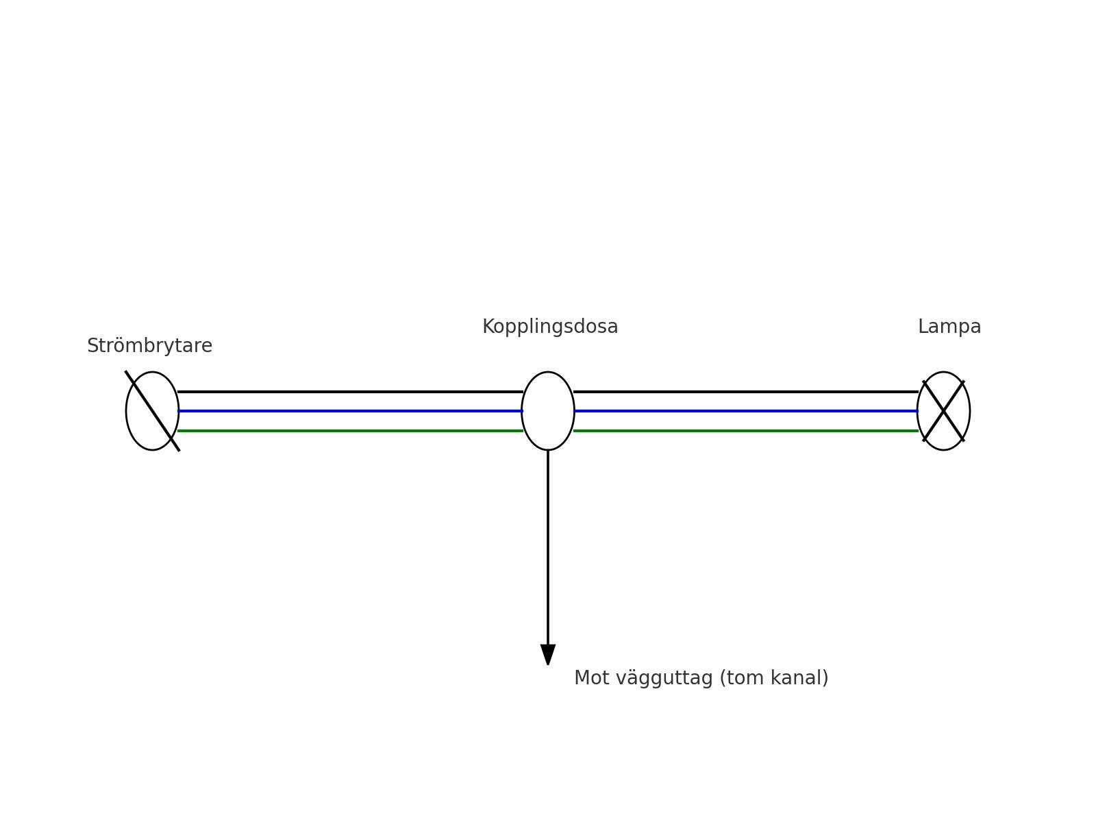 Som syns på bilden finns det en tom kanal som leder till en väggdosa, också tom. Som den dosan är placerad misstänker jag att tidigare ägare tänkt att där ska finnas ett vägguttag, vilket också hade varit praktiskt väldigt rimligt.