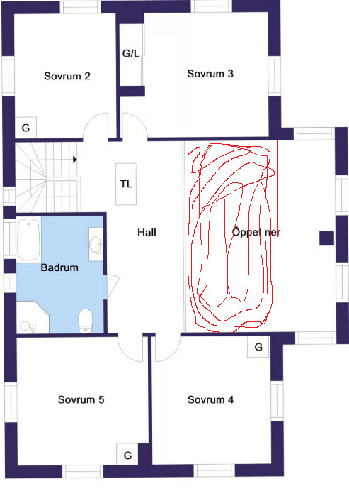 Vi tittar på ett nytt hus och funderar på om man kan regla upp ett nytt golv (röda kladdet) mellan två våningsplan? Detta för att skapa ett allrum på övervåningen.