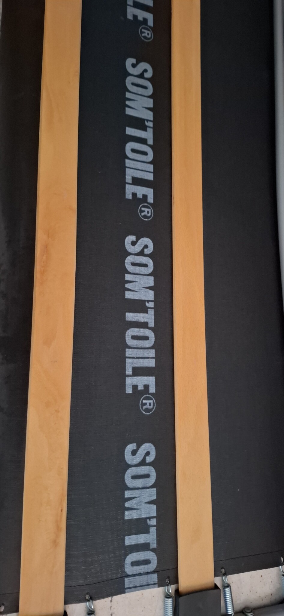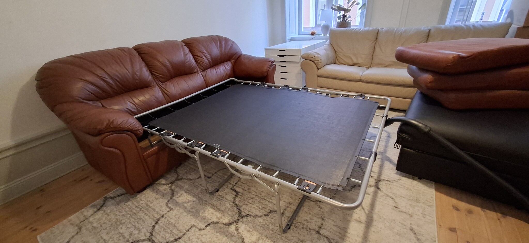 Köpte en begagnad bäddsoffa för att jag ska få sommargäster. Originalmadrassen av skum är endast 6 cm och troligen får man inte in en mycket tjockare madrass utan att slita på mekanismen i insatsten. Tyvärr känner man igenom de ribbor som finns under liggduken, när man bäddat med madrass. Gissningsvis så har duken givit med sig med tiden och blivit lite slapp, och då mer på mitten av duken. Det finns en stålpinne längs kanterna av tyget och som fjädringen fäster vid. Jag ser inte hur jag skulle spänna duken mer och om det faktiskt hjälper. Skulle vilja ta bort ribborna men då kanske sängen blir instabil. Eller om det fanns nån böjlig men stadig skiva att lägga mellan duk och ribbor? Eller annat stöd som gör att det inte blir gropar mellan ribborna när man ska sova. Har inte plats att förvara stor extra-madrass heller. Önskar tips på enkel och billig lösning. Har redan pröjsat lite för mycket för soffa och frakt för att jag inte insåg problemet innan. 😊
