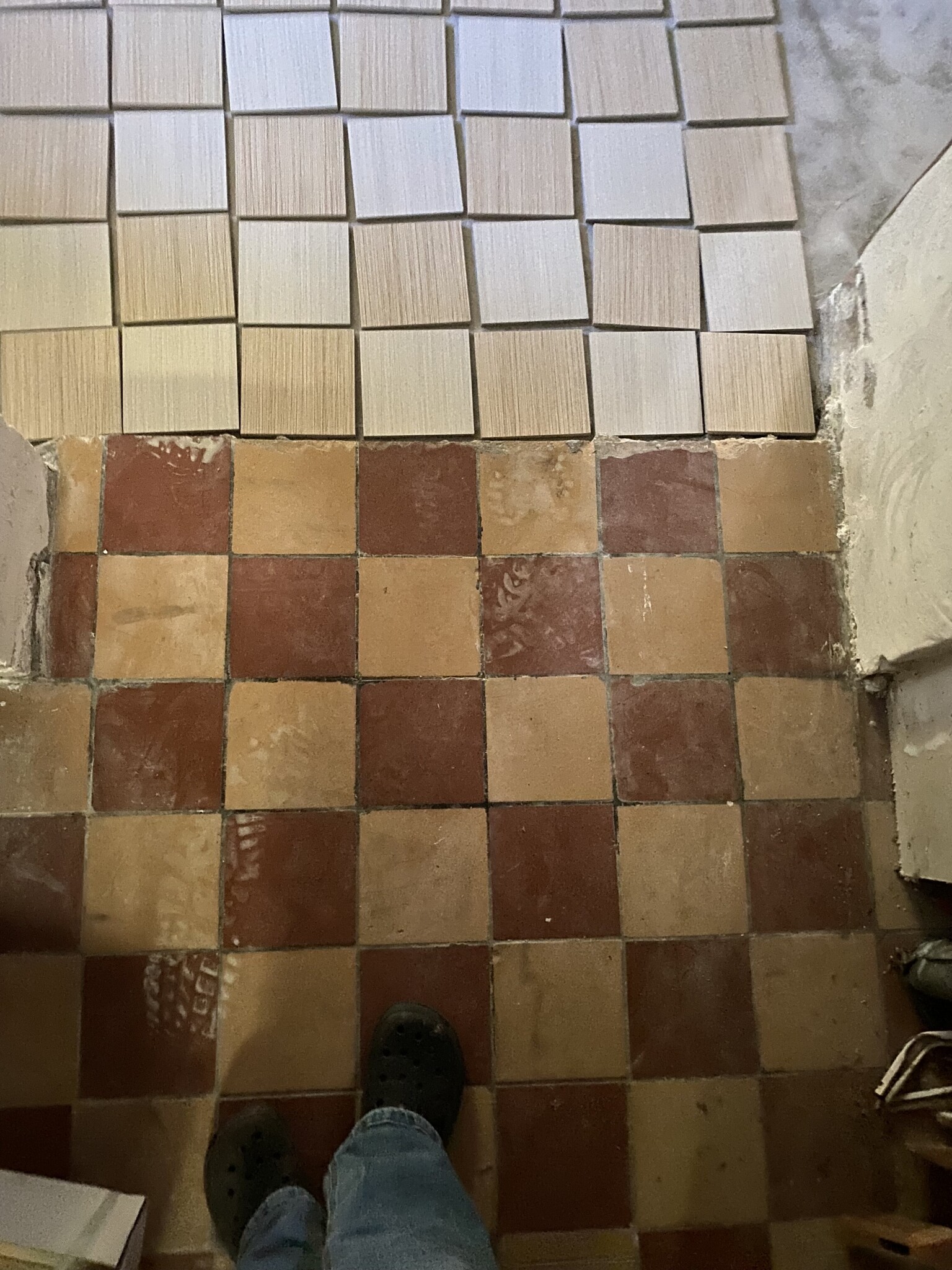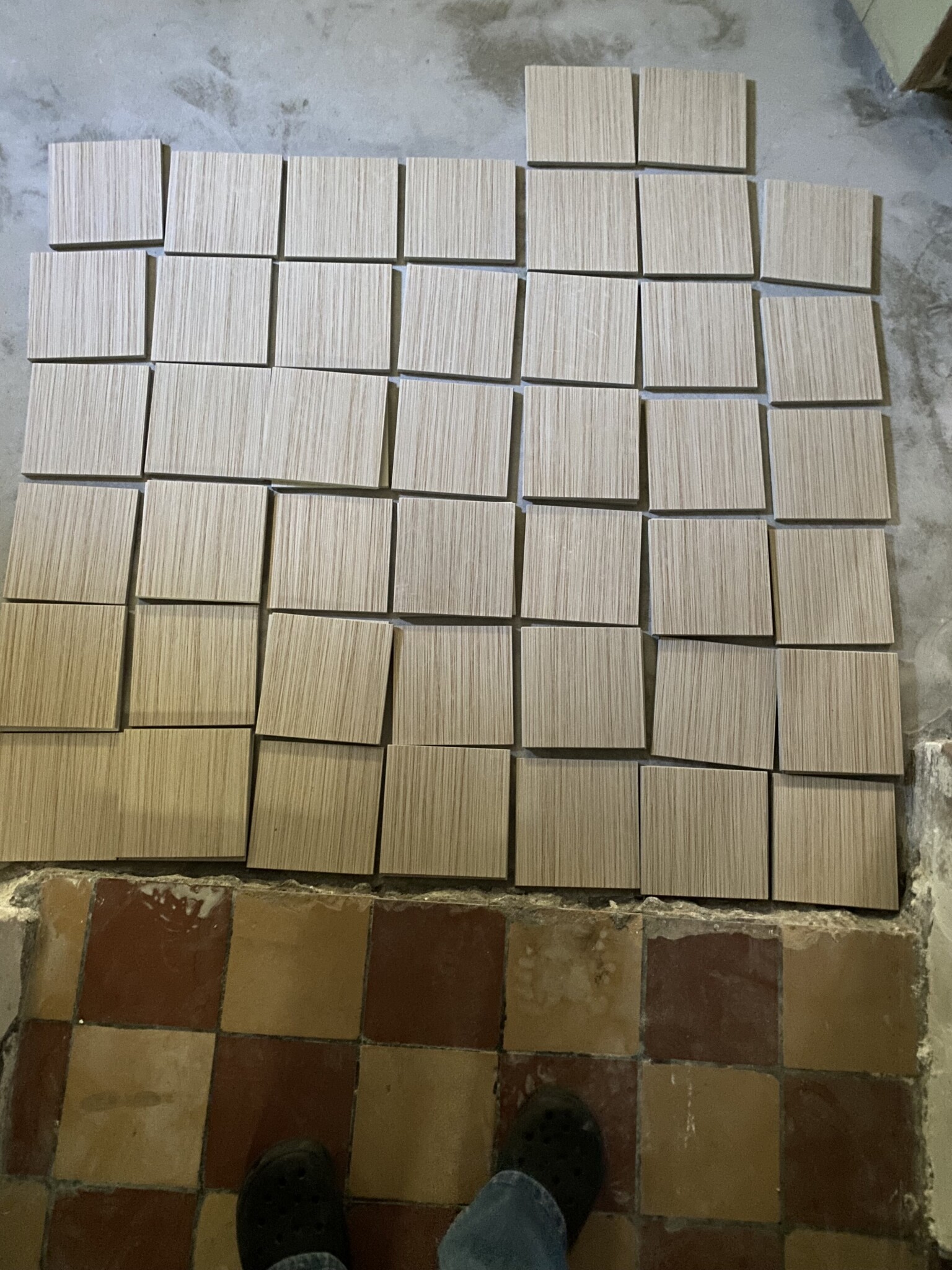 Undrar också hur vi ska kakla runt brunnarna ? Har köpt 15 cn kakel för att det ska bli mycket fog som kan andas. Vi fick vatten med följande svartmögel som nu är bortslipat och de har lagt medel på som skulle heta benetox, hittar inte det någonstans, mot möglet. Sista frågan är estetisk, ska vi göra ett rutigt golv för att knyta abc till det gamla golvet , bild 3 eller enfärgat beige, bild 4 (har lagt plattor på varandra därför det ser buckligt ut)