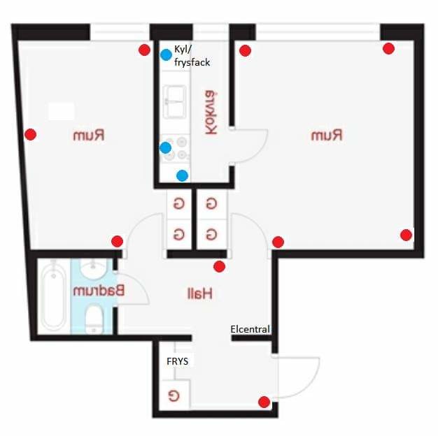 I lägenheten finns bara jordade vägguttag I kokvrån/köket (blåa prickar). Resterande röda prickar är ojordade diton.