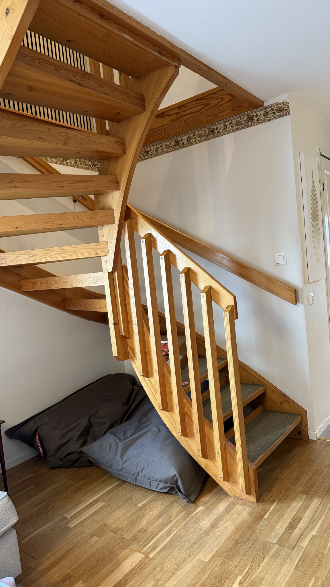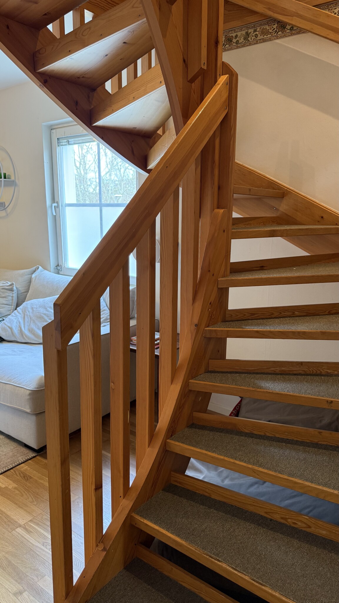 Tänkte börja ta tag i renovering av trappan. Förmodligen bara slipa och måla. Och ta bort mattan på trappstegen.