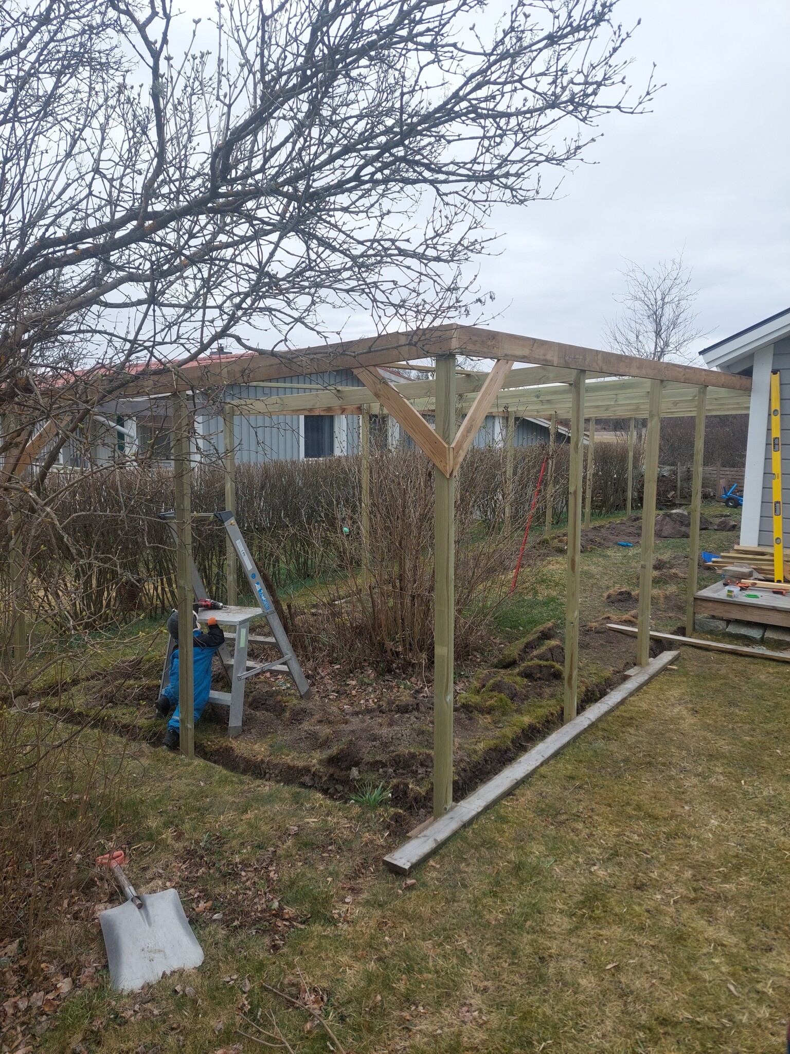 Valde att ställa stolparna på tryckt regel son kommer att hamna under marken sen. Kommer blanda lite betong och gjuta runt några stolpar för att säkra upp lite.