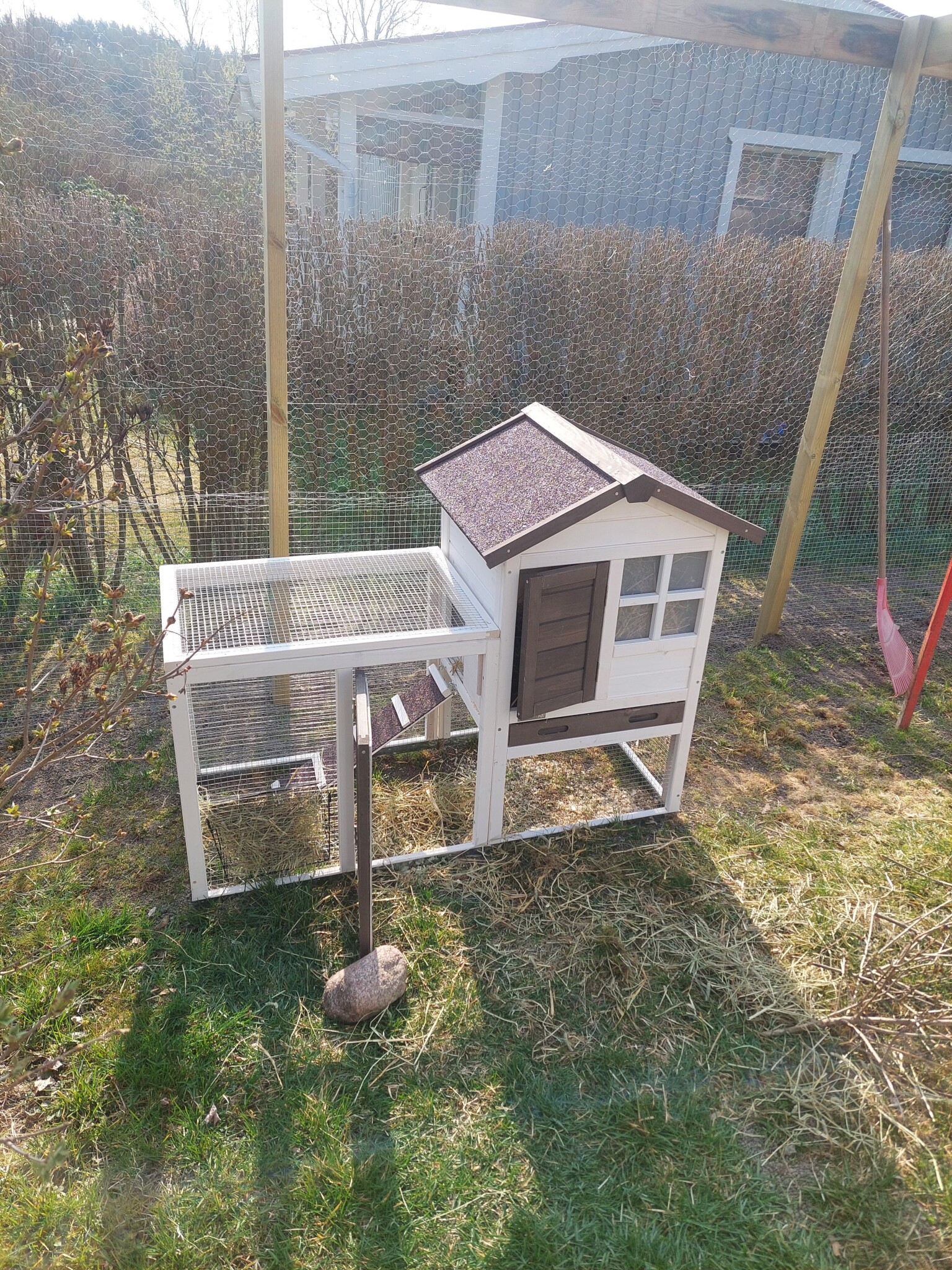 Inomhusdelen i uthuset är inte klart än så det gick tyvärr bli ett litet köpt kaninhus (tror min fru ville ha det ändå för det är "gulligt")
