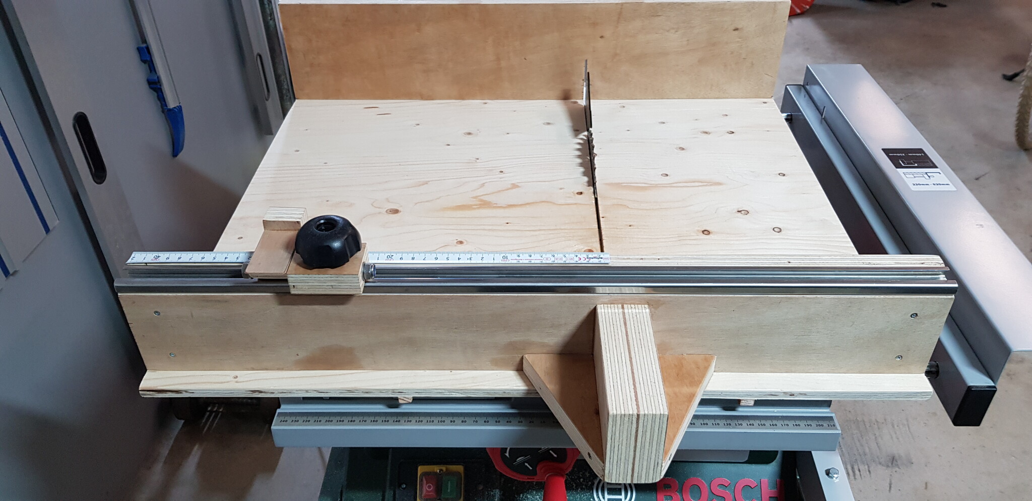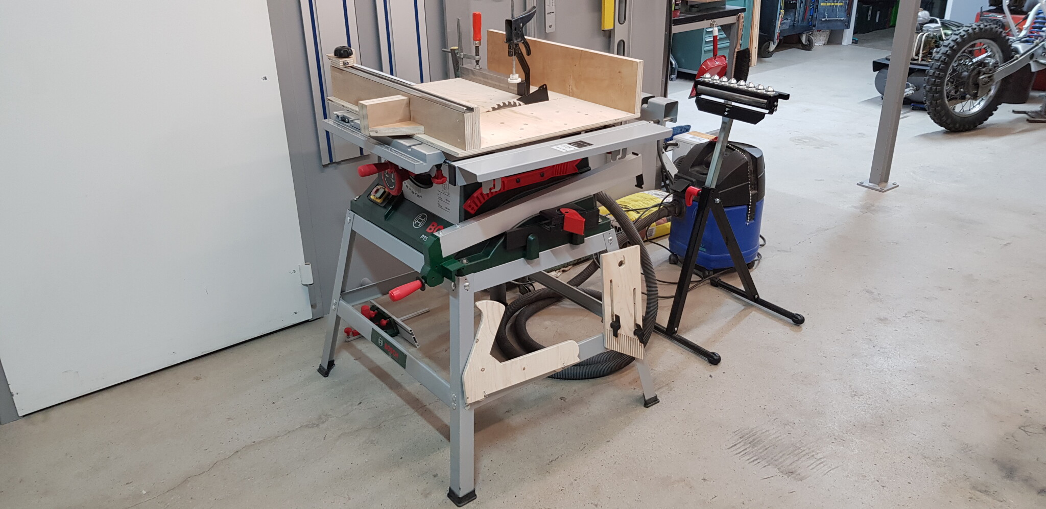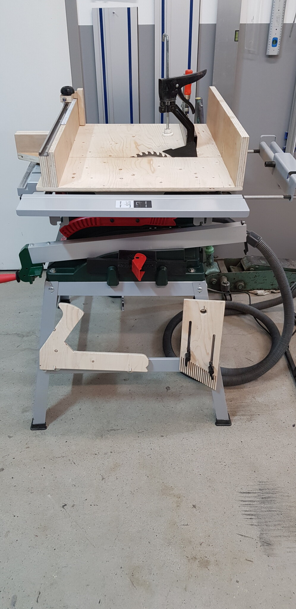 Jag kan inte ha SUVA från taktet då jag flyttar på sågen. Löste istället problemet genom att sätta ett klingskydd (beställt från Dewalt för det som följde med dåvarande såg Bosch GTS saknade utsug) på en ribba som jag spänner fast i t-spåret på anhållet. Det var en kvarts jobb med lite spillbitar och en tving, tanken var att göra det ordentligt senare. Men det är nu minst 10 år sedan och fyller sin funktion tillräckligt bra 😊