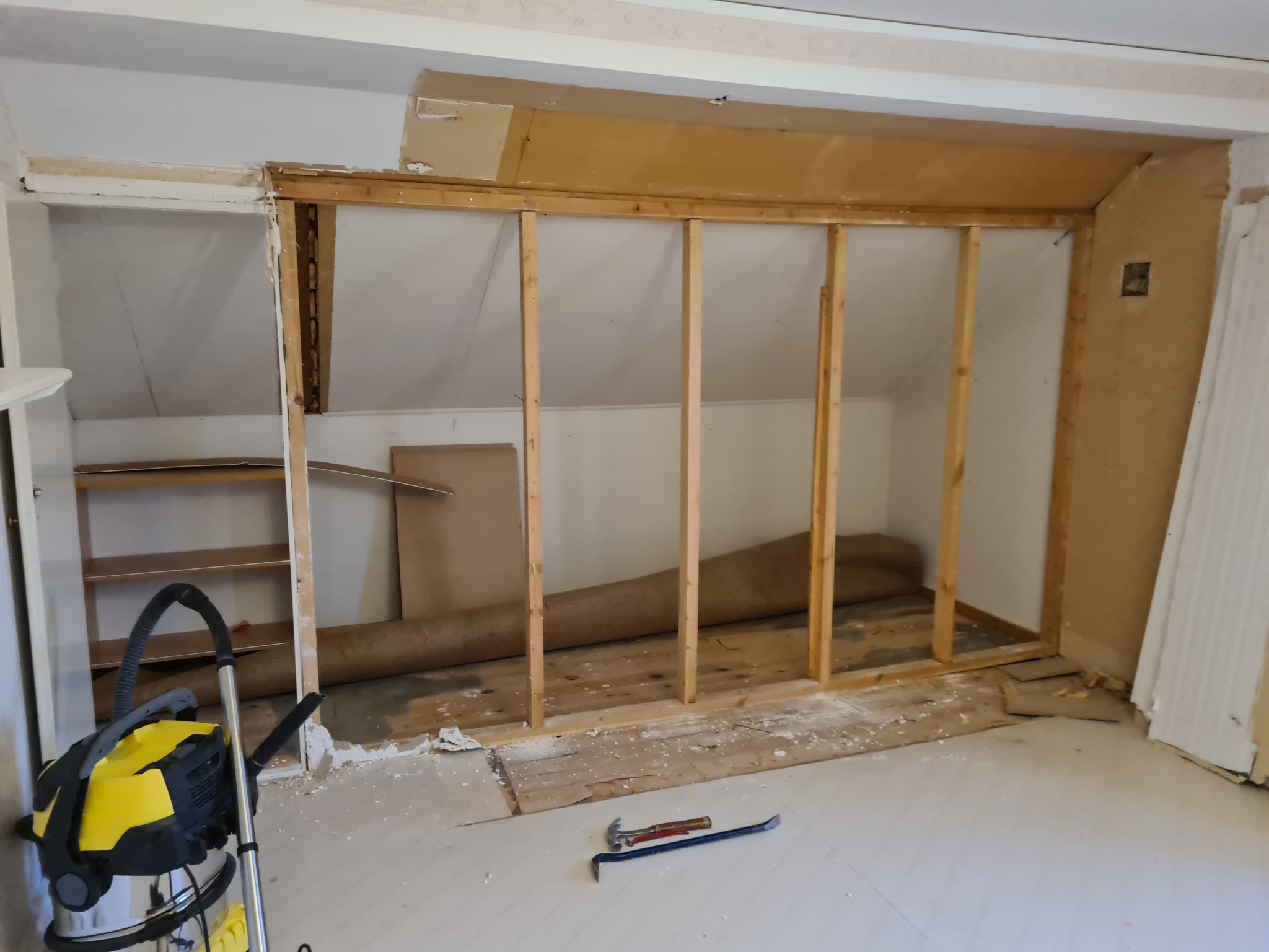 (Ny vägg ska reglas upp drygt 1 meter utanför denna)