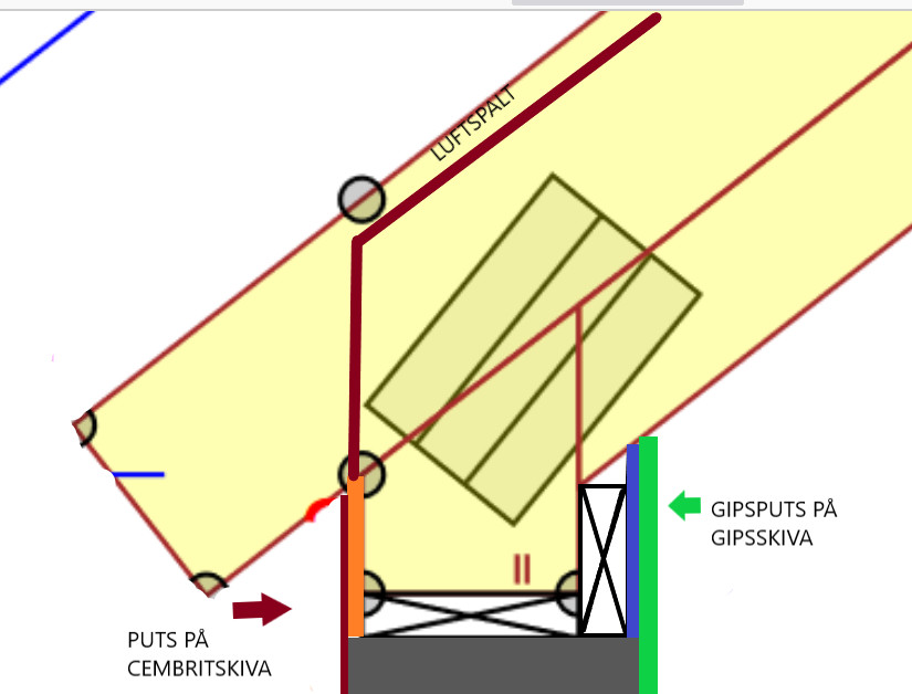 Jag håller på att bygga ett mindre fritidshus i lättbetong och har nyligen fått upp takstolar och tak. Håller på att klura hur jag bäst och snyggast gör för att klä in takfoten och tänkte se om det finns någon här som kan bolla tankar med mig. Jag har kommit fram till ett förslag som jag bifogar en slarvigt ritad bild på. Tanken är att då klä in hammarband+takfot utvändigt med Cembritskiva så att den livar med ytterväggen, och sedan putsa över båda. Och samma princip på insidan fast med gipsskiva och gipsputs. Någon som kan se några direkta nackdelar med detta? Hur gör jag te.x. för att övergången mellan skiva och vägg inte ska spricka? Eller det klarar putsen upp?