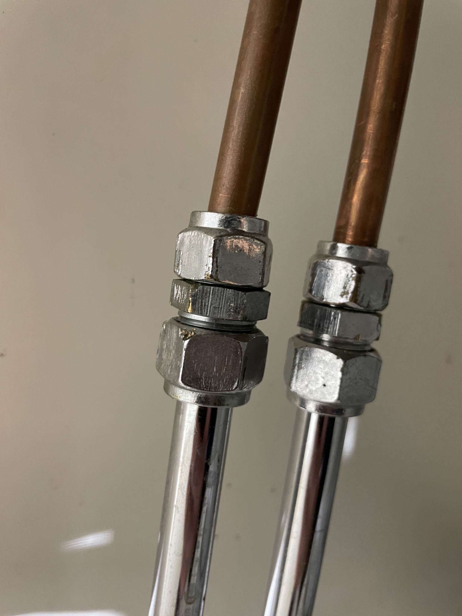 Blandade tillverkare på olika klämringskopplingar, och upp mot blandaren ser det ut att man har glömt stödhylsor för muttraran har "bottnat".