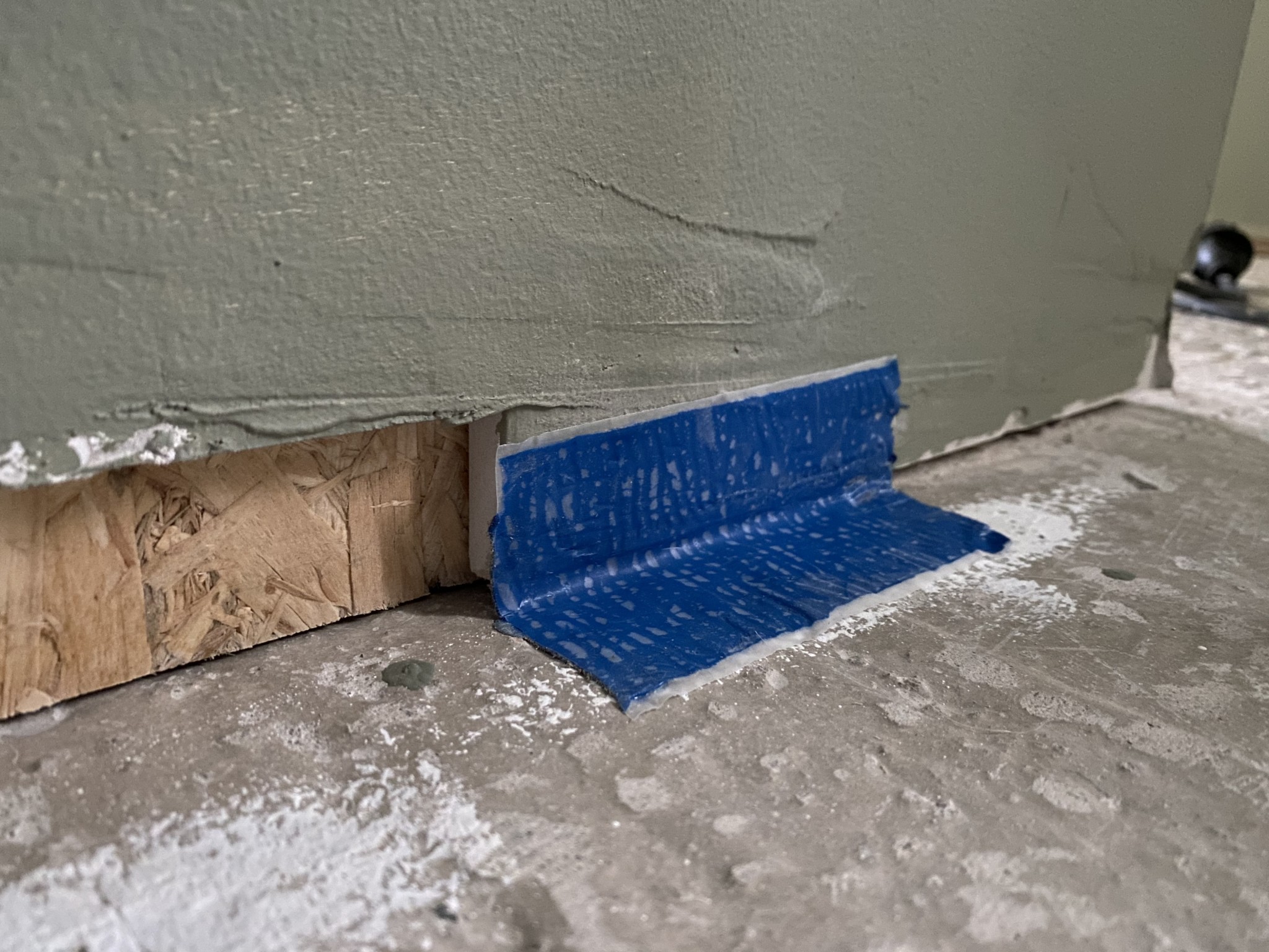 Problemet är att jag "råkade" skära av diffusionsspärren som sitter i väggen och gick ut på golvet (Se bild), detta för att kunna täta vinkeln mellan vägg/golv med Platon Skarvband (Se bild, blå tejp). Men inser nu att det kanske inte var så smart då det nu kanske uppstår en risk för läckage av fuktig luft via vinkeln vägg/golv där jag skar av plasten.