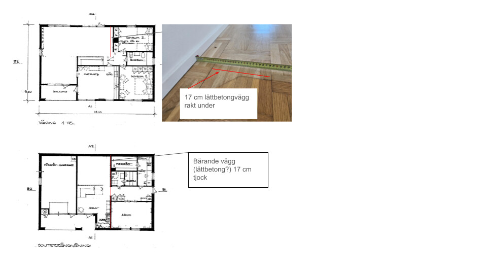 Kaminens placering blir så att ca hälften av kaminen står ovanför en bärande 17 cm tjock lättbetongvägg på sutterängplanet, dvs kaminens bakre del skulle stå rakt ovanför väggen medan den främre delen skulle stå på lättbetongbjälklaget (som vilar på väggen).