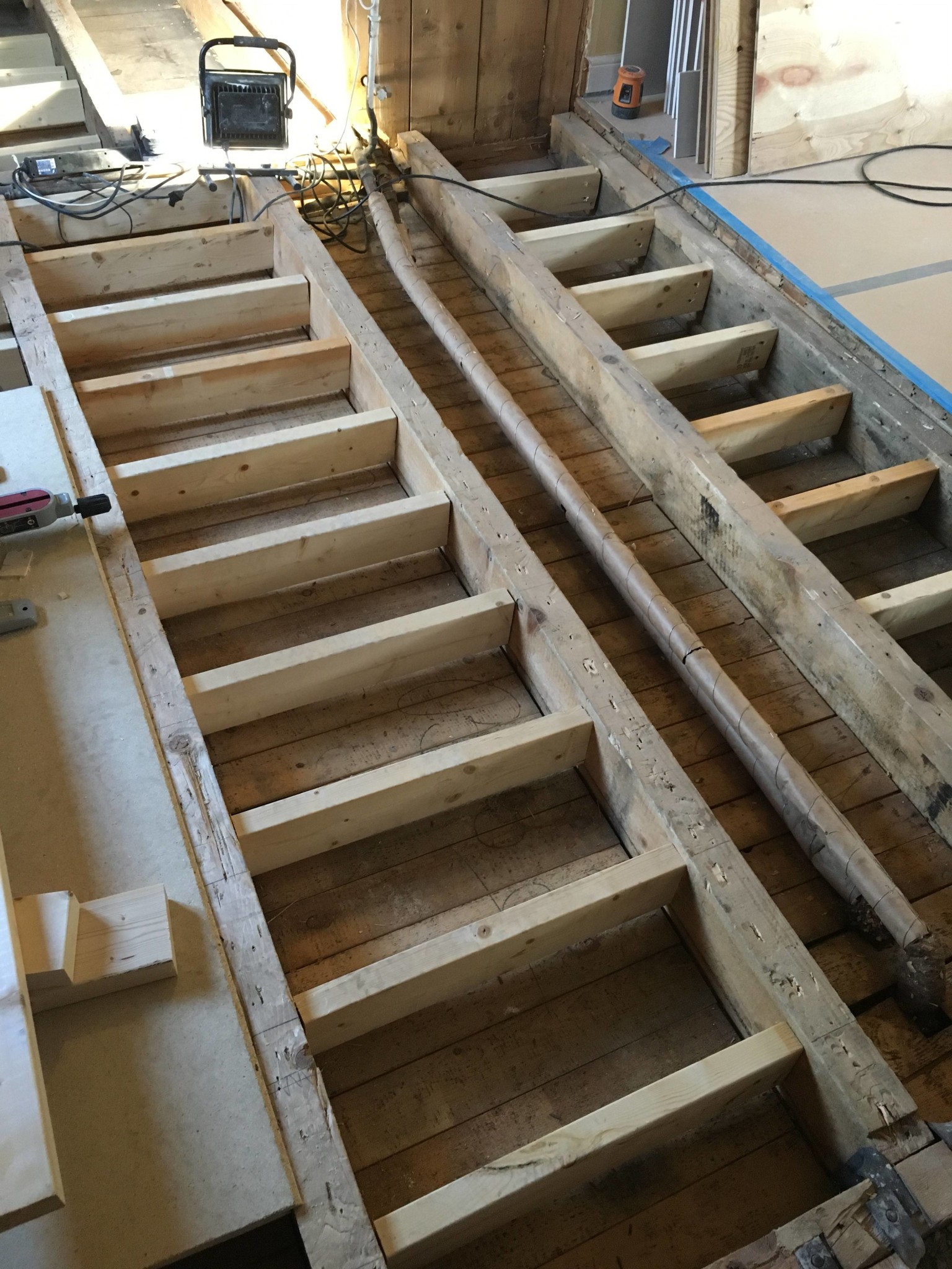 - På dessa kortlingar har det sedan lagts golvspånskivor nedfällt mellan reglarna.