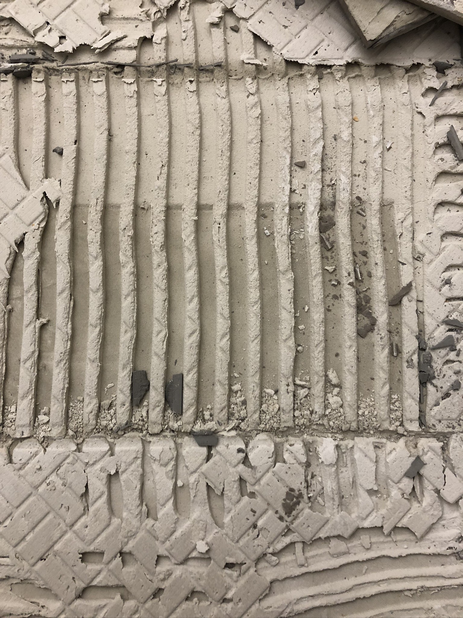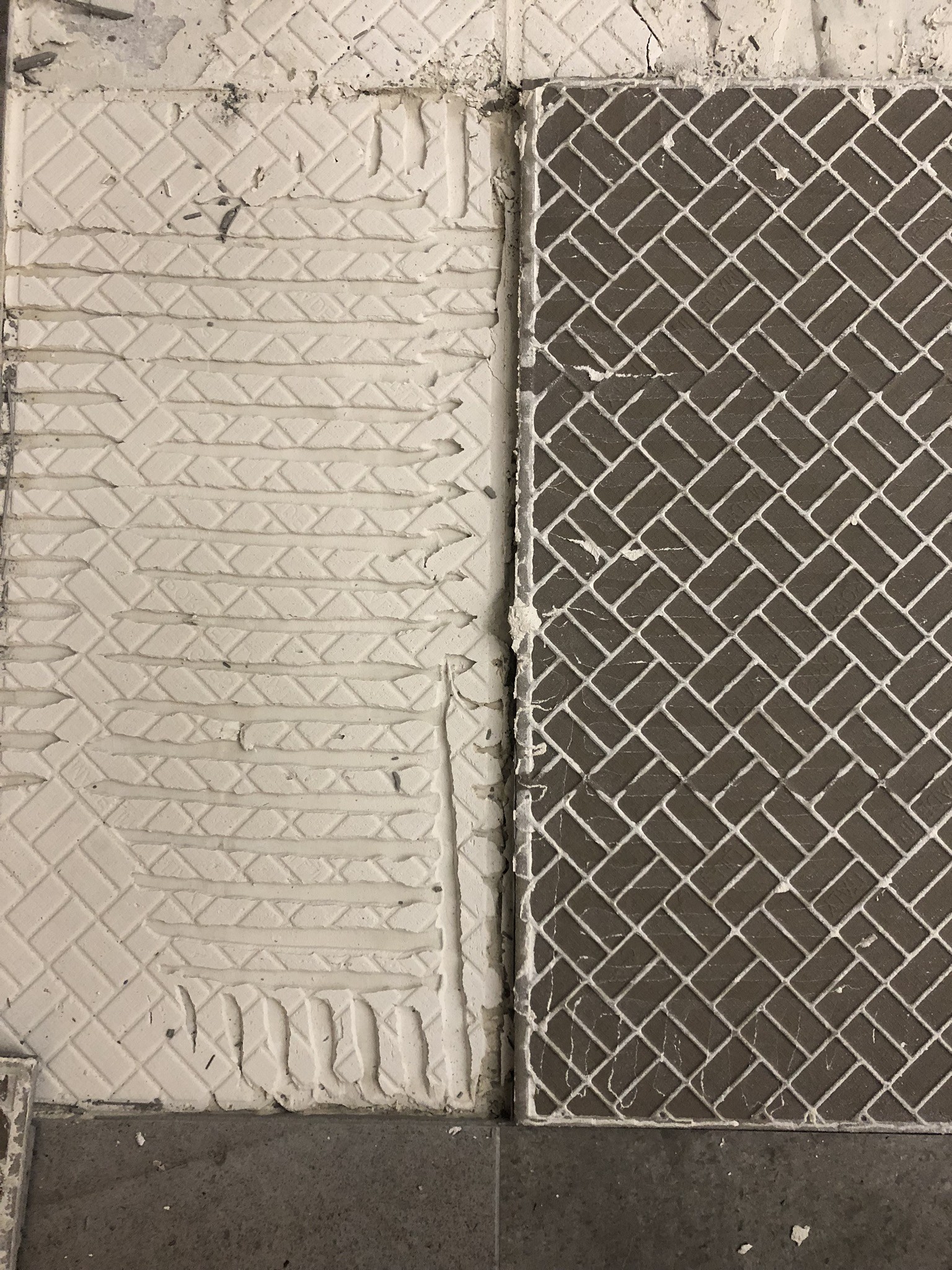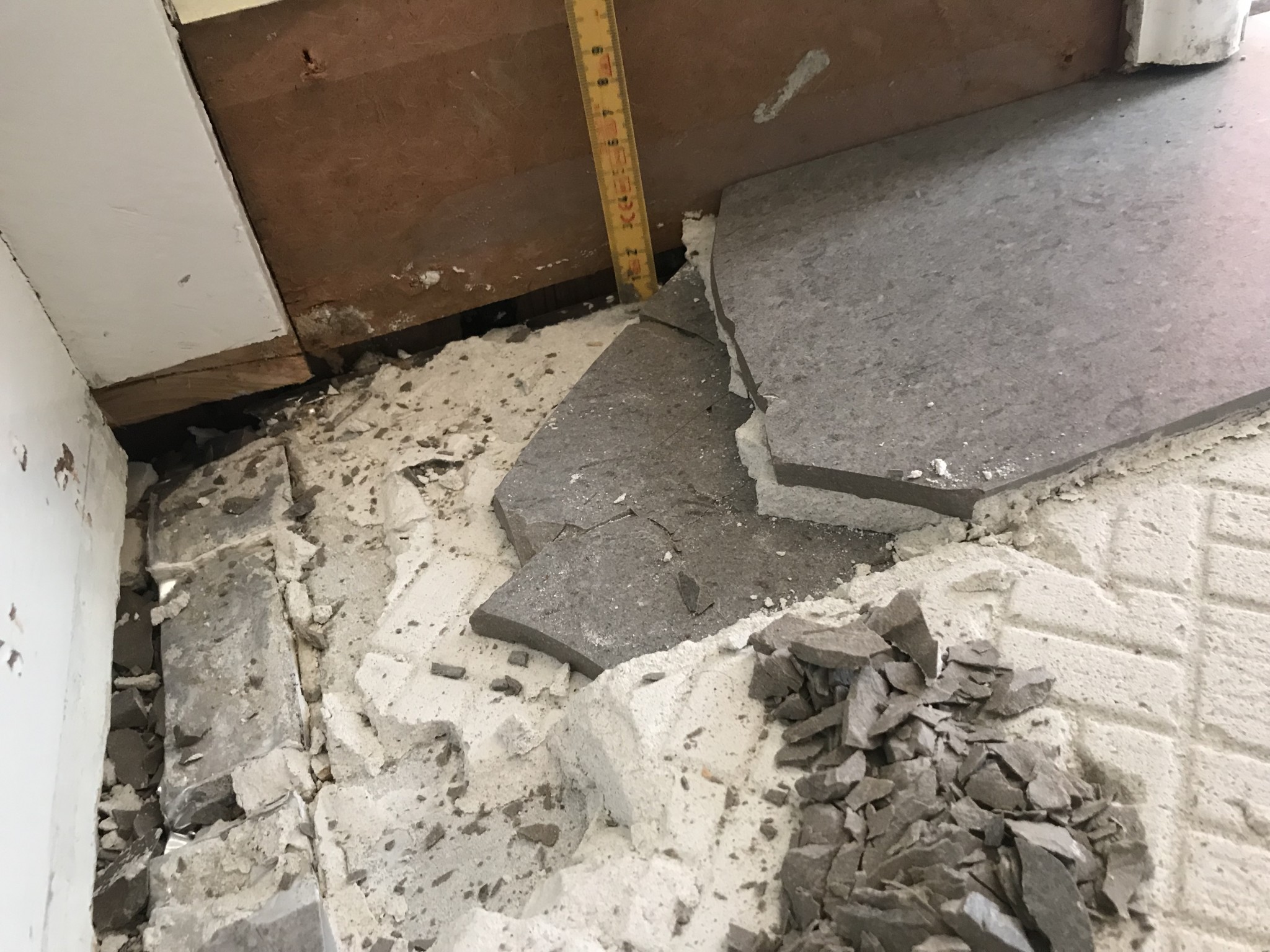 - Direkt på dessa skivor har det lagts klinker med LIP Multifix lätt. Plattor har på vissa ställen legat dubbelt och fixet har varit väldigt ojämnt applicerat. De plattor vi lyft lossnade vad vi tror är väldigt lätt och har varit väldigt rena på baksidan när de tagits upp