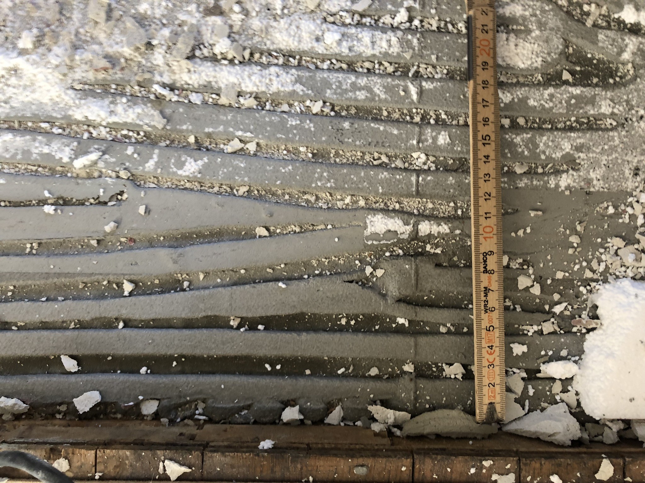 Vi har börjat riva i ett relativt nylagt klinkergolv då det dykt upp väldiga tveksamheter gällande utförandet då det börjat lossna någon platta. Tanken från början var enligt hantverkaren själv och avtalet att komplettera bjälklagets regelstomme till cc 300 som idag är mellan cc 600 och cc 700 sedan lägga spårad spån, armering, flytspackel och sedan klinkers med 30x60 plattor. Max spännvid på bjälklaget är 4,2m (2x50x180 förskjutet med 20mm i höjdled från 50-talet) och total sammanhängande yta är ca. 25kvm.