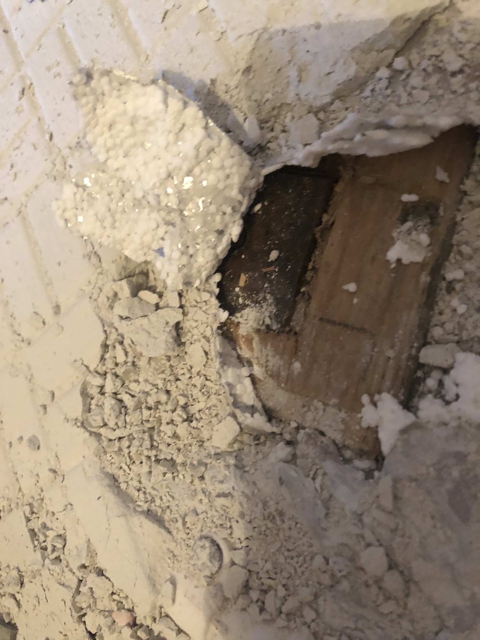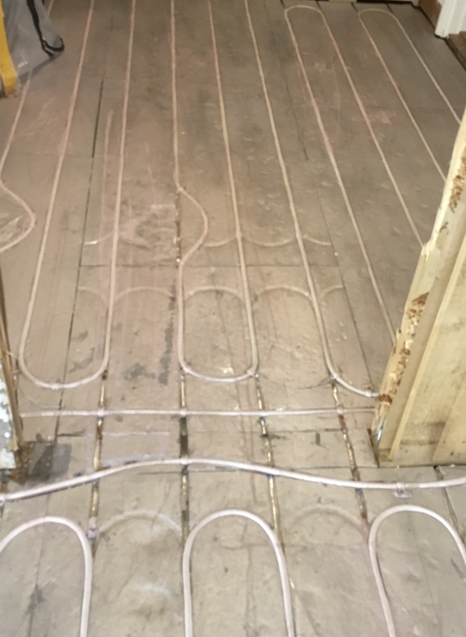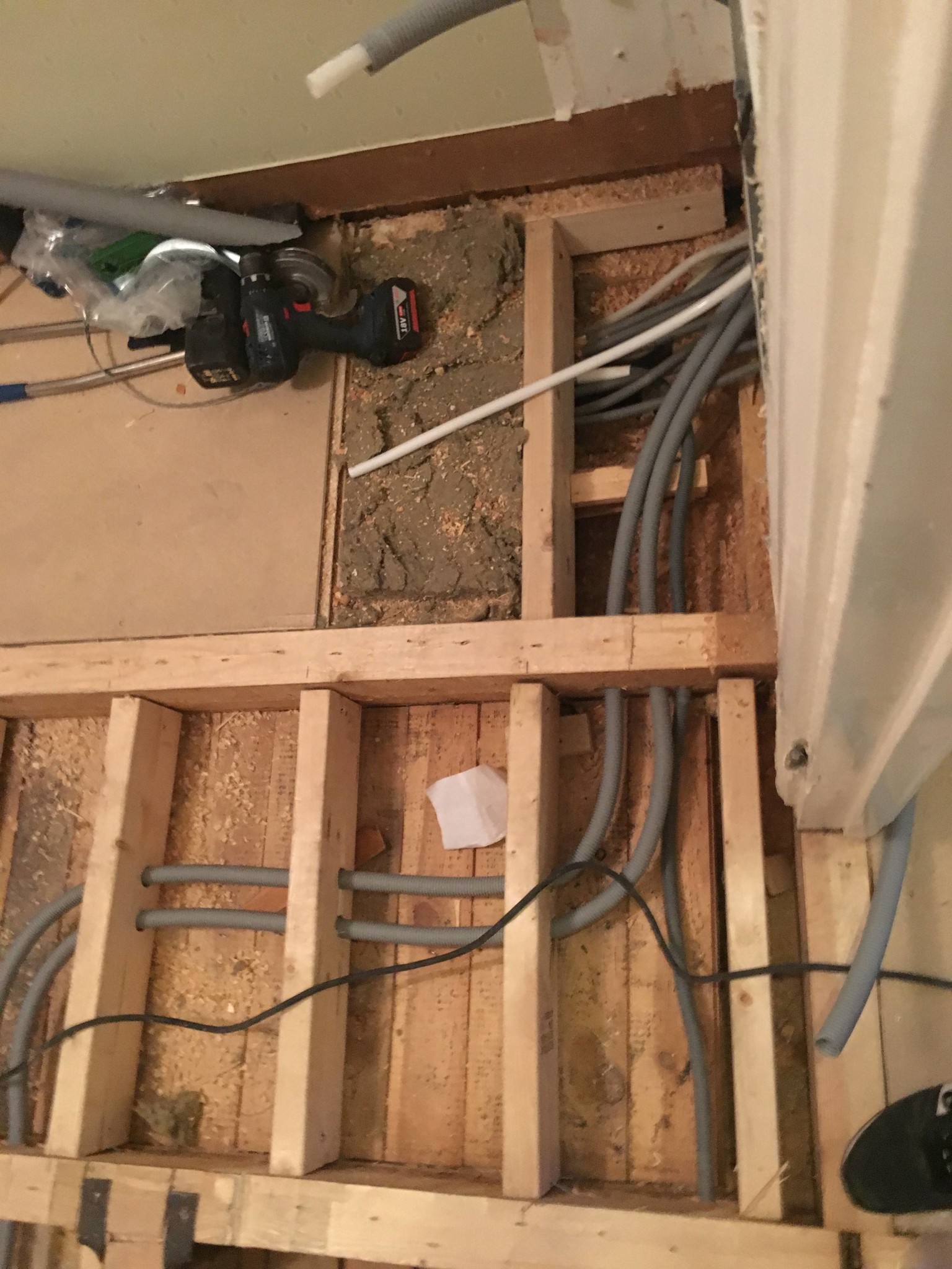 - Sedan monterades en Flooréskiva (Aluminiumbeklädd EPS) på 17mm som monterades med LIP flytfix. Där har de även karvat ur EPS från skivorna för gamla avväxlingar (där slangen tar en liten extra böj på första bilden nedan). Ytflytningen på flytfixet ser ut att ha varit dåligt på några av de ställen vi tagit upp det på