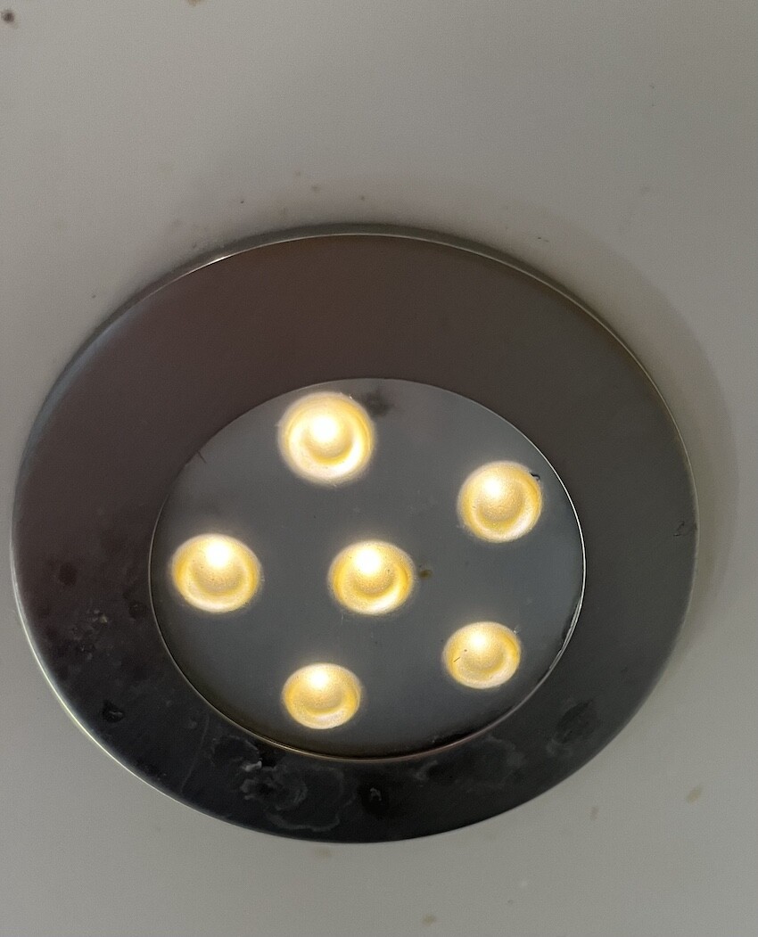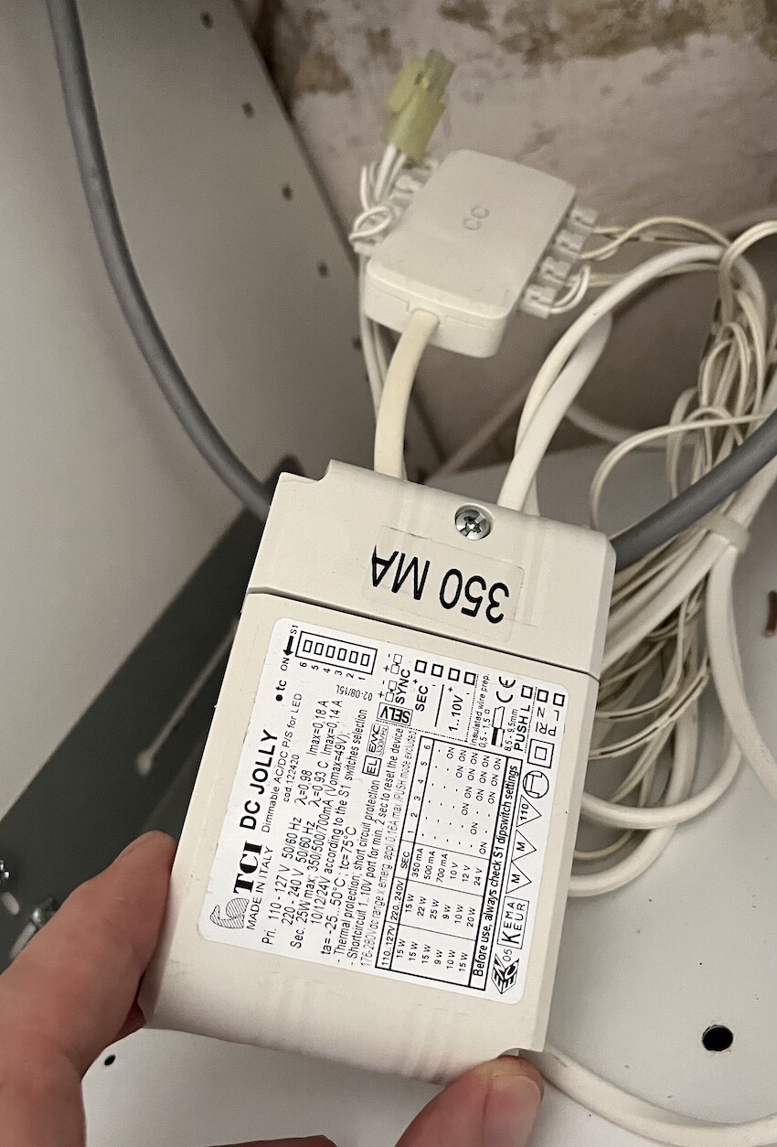 Har tre Loevschall-spottar + Jolly-driver. Spottarna lyser extremt svagt (svagare än vad man tror av bilden). Min erfarenhet säger att det oftare är drivern än spottarna som går sönder. Hittade en exakt likadan driver och bytte (nya också inställd på 350 mA), men felet kvarstår. Nästa steg kan ju vara att köpa nya spottar, inga stora pengar. Men är det verkligen troligt att tre spottar lägger av på det här sättet (inte helt, utan de lyser med svagt ljus)?