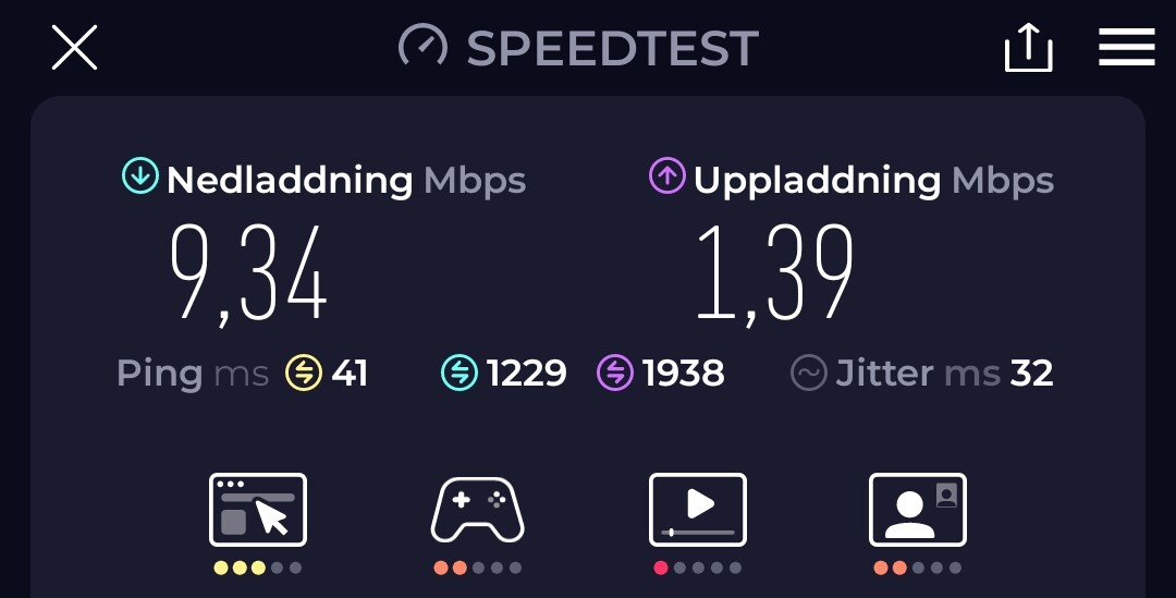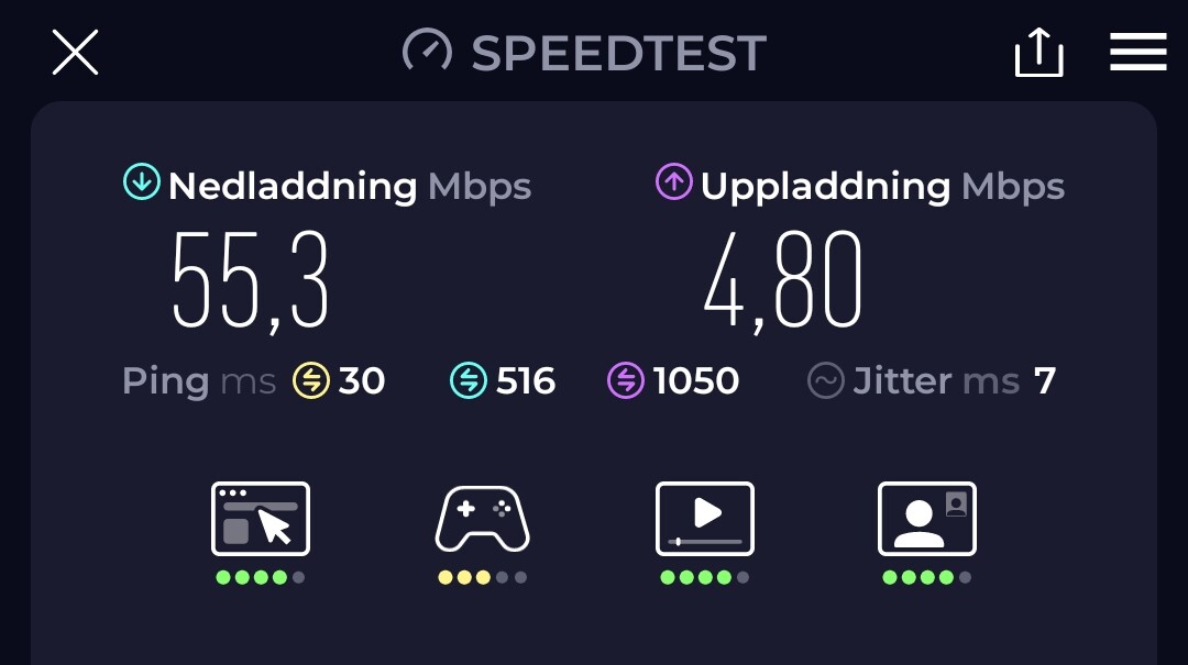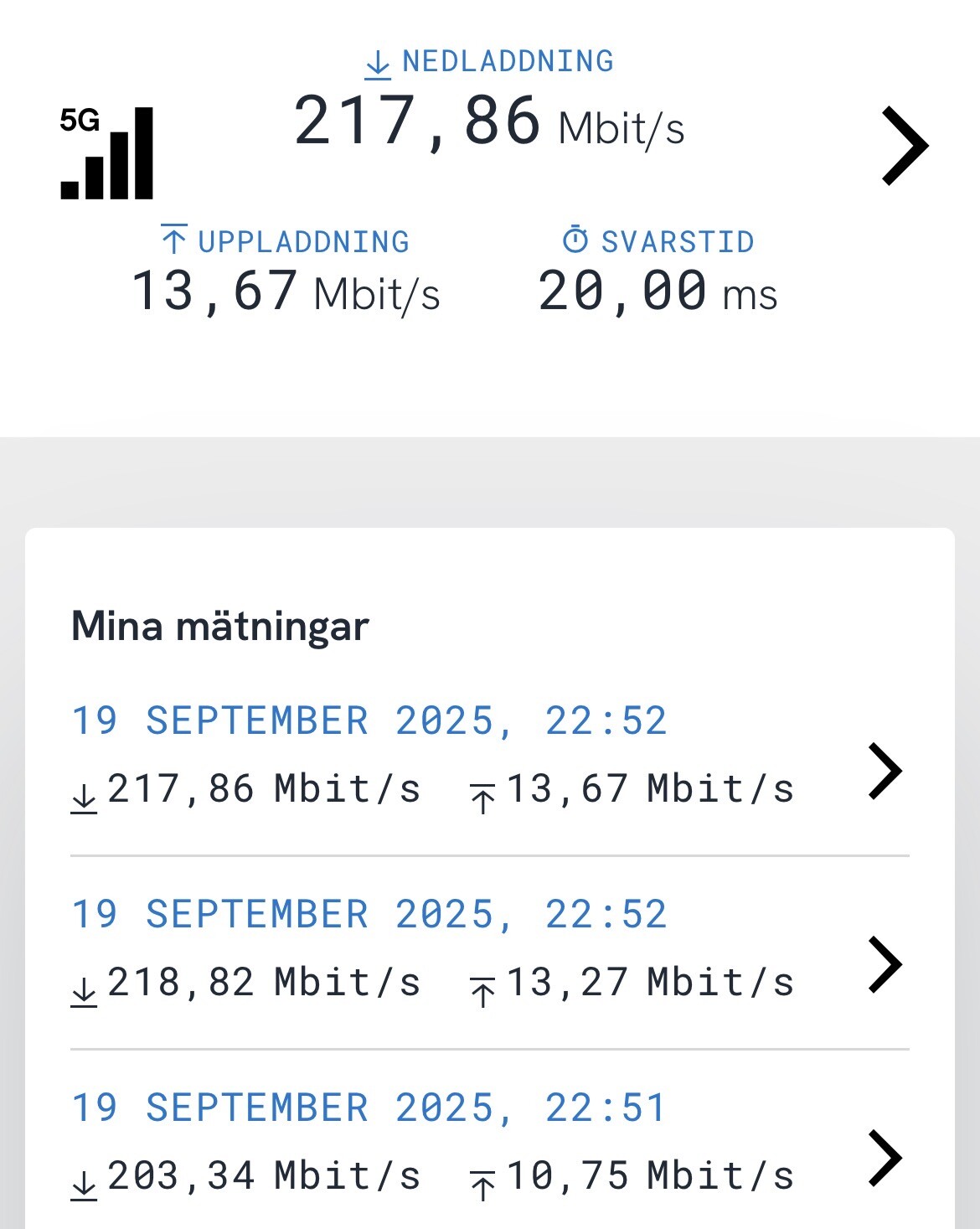 Nu är jag i torpet på vischan, fredag kväll kl 23, ett par mil norr om Katrineholm. Mäter inomhus med mobilen med 20 cm timmerväggar och får helt OK siffror. Kommer troligen att köra 5G här också och sätta fibern på paus, hela familjen har dessutom obegränsad 5G-surf på sina enheter. Jag betalar 384 kr/mån för 100/10 via fibernätet och är här kanske 2-3 veckor per år.nikasp skrev: