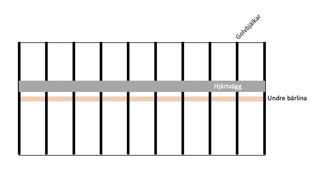 Precis som TS i trådstart förstår jag heller inte problemet med hjärtväggen. Den går ju vinkelrätt mot golvets bärande bjälkar. Ett lager golvspån mellan hjärtväggens fot och golvbjälkarna kan väl endast vara till godo? Det fördelar ut lasten och förstyvar golvbjälkarna så att de inte kan röra sig i sidled. Så här (hjärtväggen i grått står på golvets bjälkar i svart, undre bärlina under golvbjälkarna i rosa):