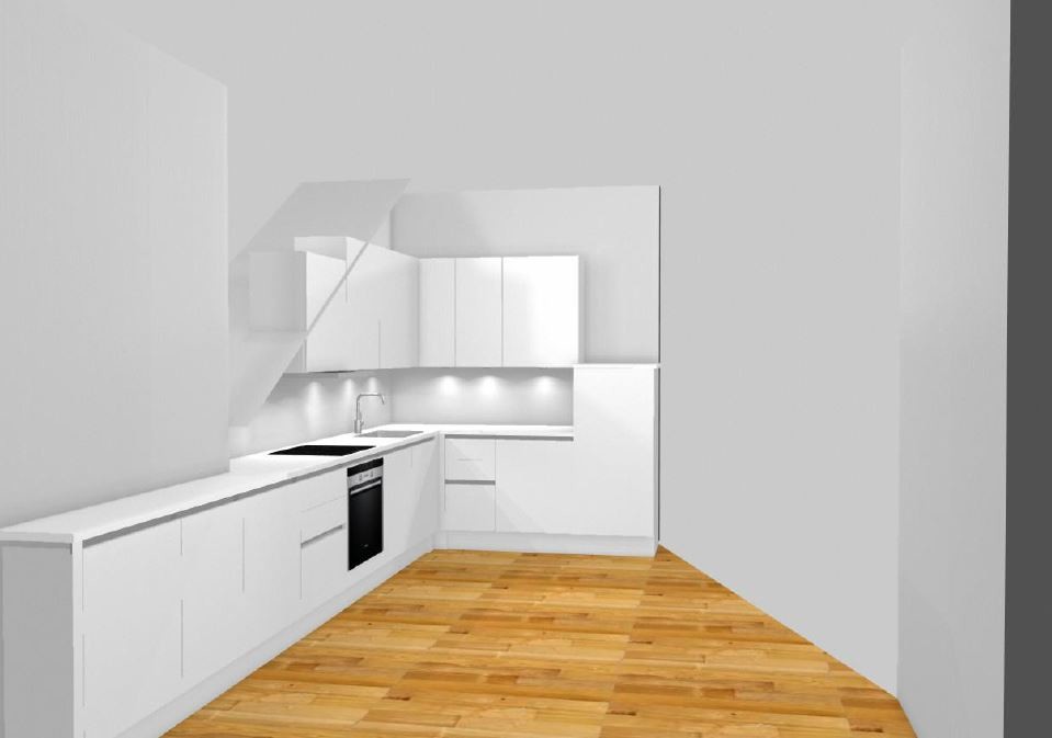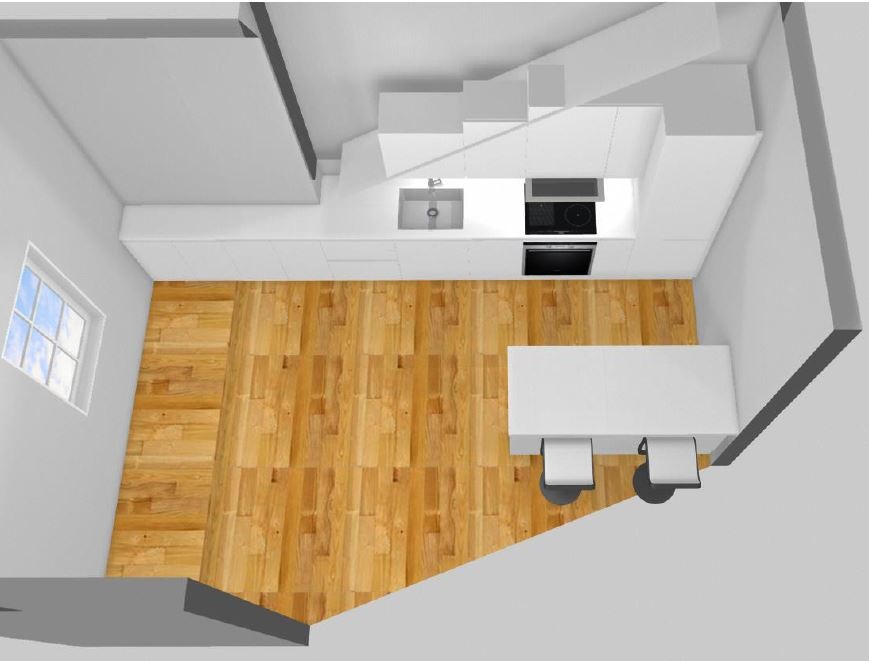 Detta är snarlikt hur det ser ut idag, med några små förflyttningar av vitvaror, samt köksön som inte finns idag, vi tror det kommer bli för smalt mellan köksön och övriga skåp.