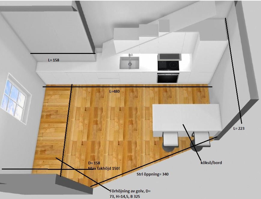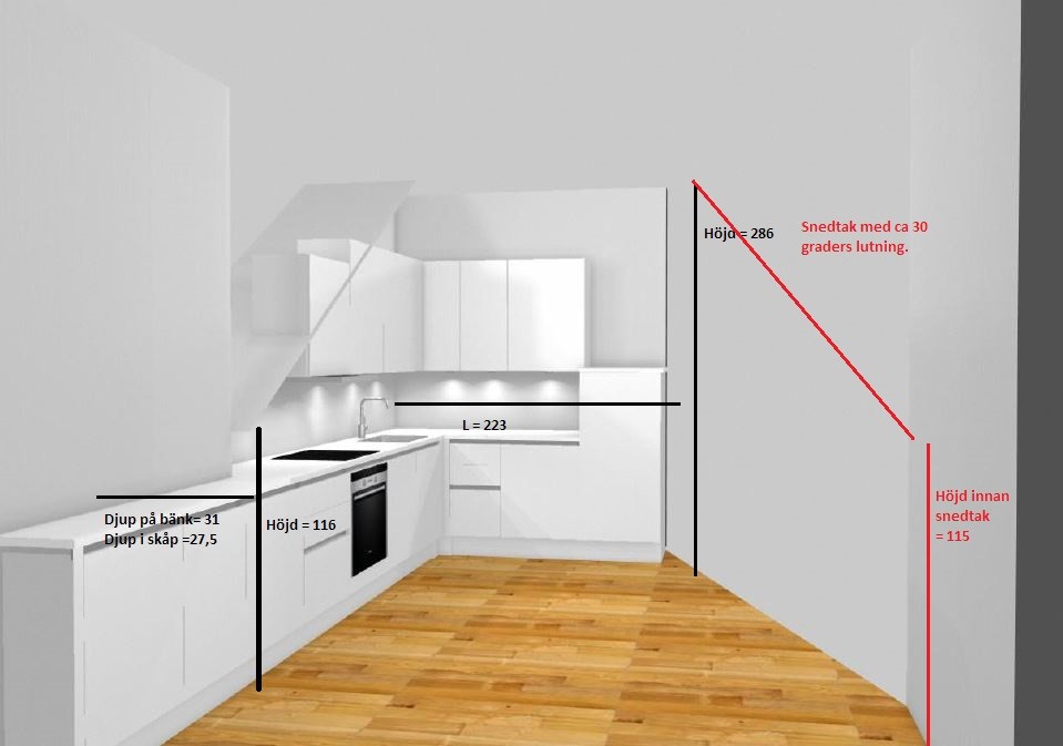 Jag, skulle nog fundera på att placera bordet närmre fönstret. Ta bort lådorna vid fönstret för att göra utrymmet större. Fylla utrymmet under snedtaket med lådor och flytta häll och disk till väggen. Ugnen kan då placersas till vänster under snedtaket. Titta på Ikeas lösning på URL:http://www.ikea.com/se/sv/catalog/categories/departments/kitchen/roomset/20134_nkro12a/