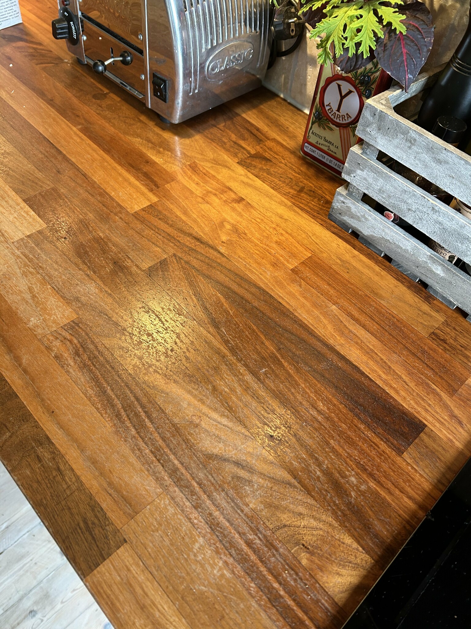 Använder man enbart paraffinolja till bänkskivorna får man jobba i onödan tycker jag. Använder man i stället en härdande olja, jag har valt Osmo, skyddar den på riktigt. Mina skivor i köket är tre år gamla och det blir ofta vatten liggande på dem. Snart är det dags för ett tunt lager, då det syns små repor där det bakats.