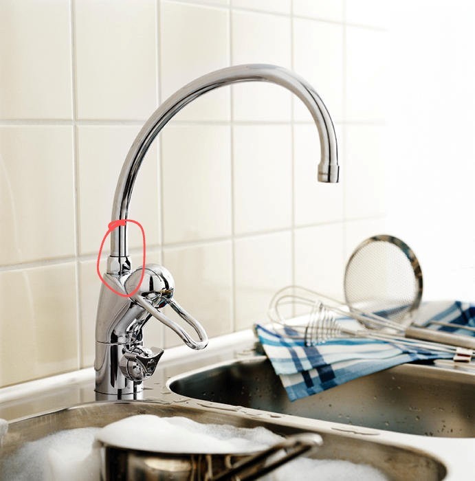 Har en kran i köket i denna stil, och själva halsen av kranen sitter helt löst. Det är som att muttern har gängat ur på något konstigt sätt, går att skruva åt om man lutar kranen men lossnar lika snabbt endå. Hur löser man detta och hur har jag lyckats åstadkommit detta? (Se röda cirkeln)