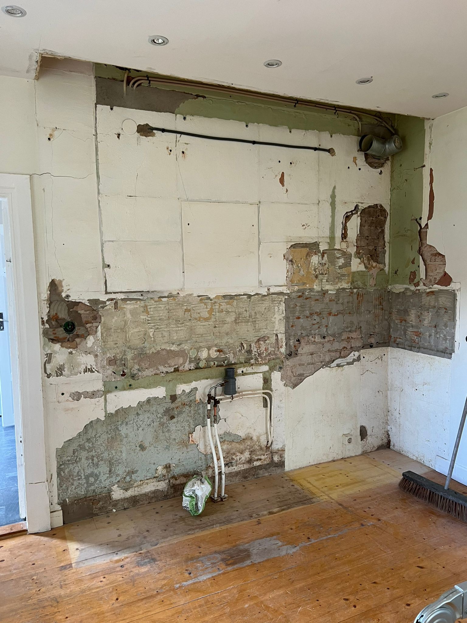 Bilden nedan visar hur väggen såg ut efter vi tog av det förra köket men innan ett nytt lager spackel har lagts för att jämna ut ytan. Nu man kan inte se var hållen och ojämnheterna är längre.
