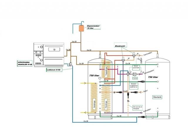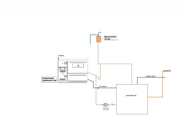 Självcirkulation från kökspanna till accumulatortank i källaren.