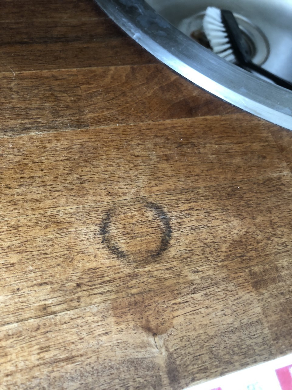 Ibland funkar det att ”resa” träet med värme+fukt. Vet inte om det skulle kunna funka där, kan nog bero på hur ytan är behandlad. Men om det går att resa upp så kanske du kommer åt att slipa bort missfärgningen.