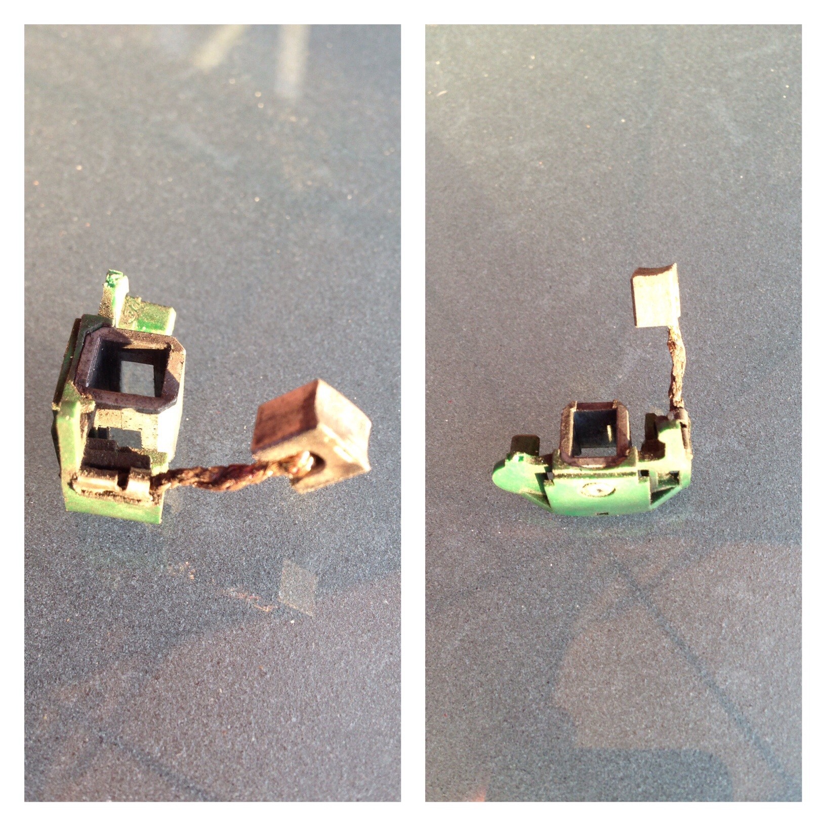 Vi har nu plockat ur en hållare och så här ser den ut med slitna kolet