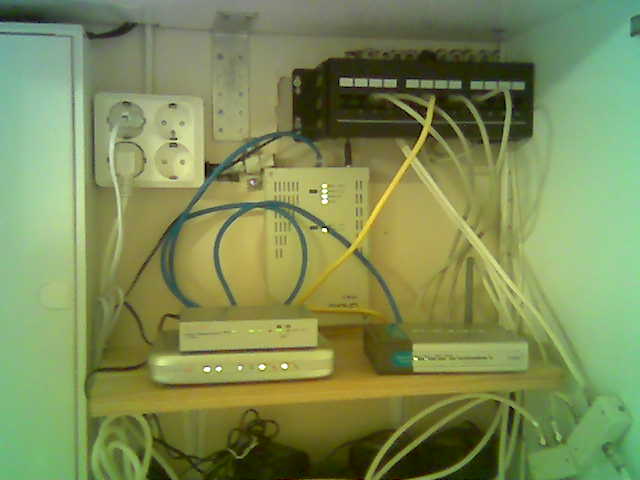 På hyllan från vänster: telemodem, bredbandsmodem, trådlös router 54 Mbs. Inkommande fiber på vägg ovan, 100/10 (Telias utan kostnad!).