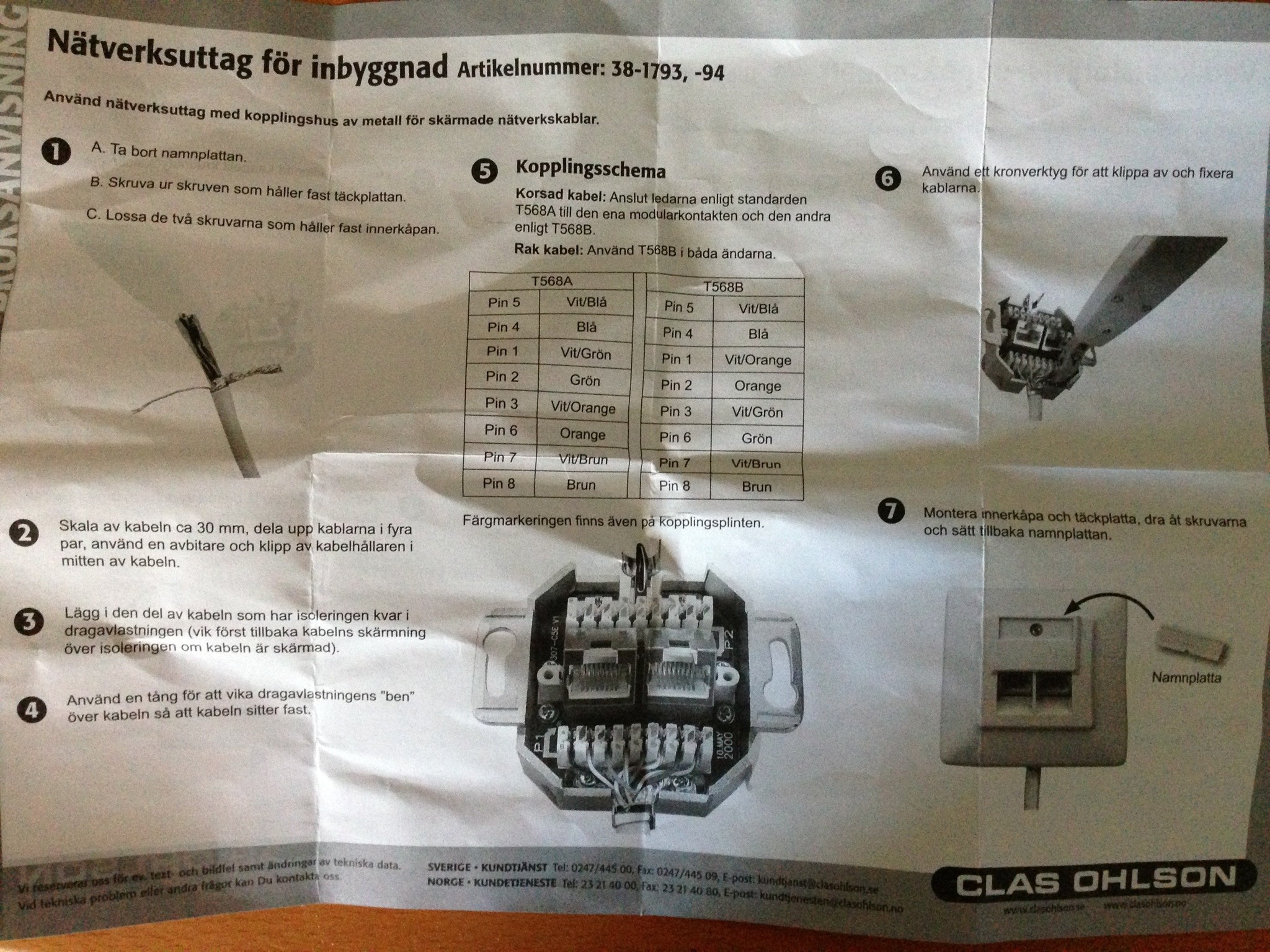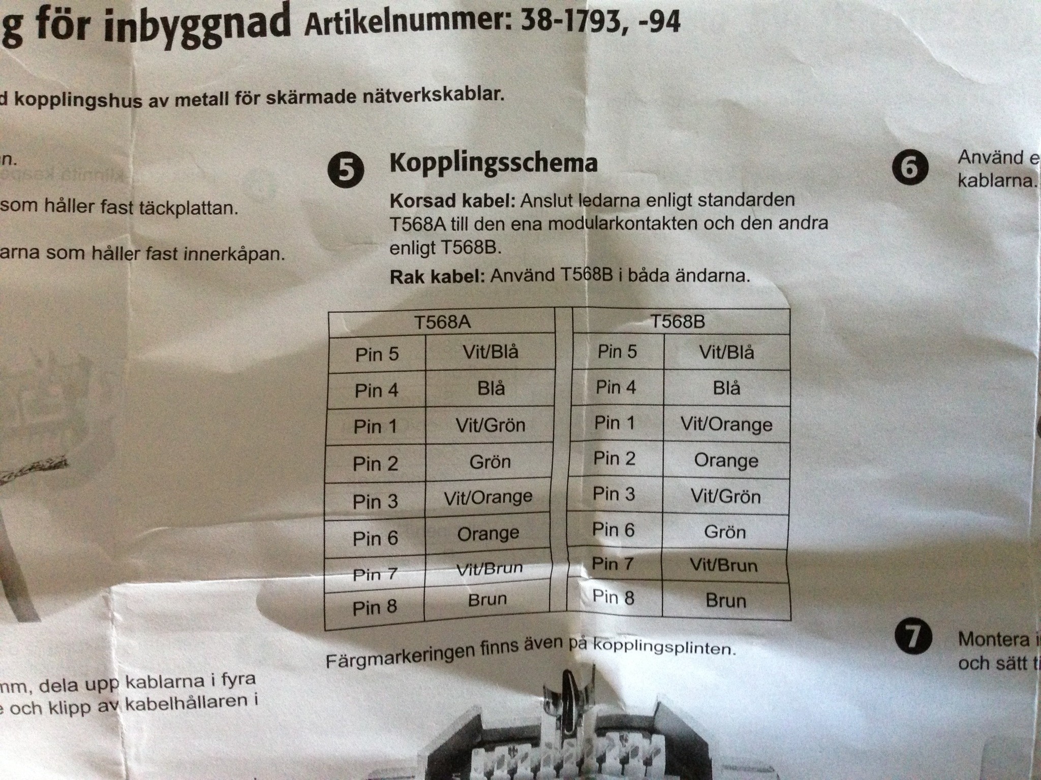 Ja, OK. Det är lite illa skrivet, men det är faktiskt korrekt. De skriver att om du vill ha en korsad kabel (och det vill du inte) så kopplar du A i enda änden och B i den andra. Om du vill ha en rak (och det vill du) så kopplar du B i båda ändar. För ett uttag så skall man naturligtvis koppla en "rak" kabel mellan uttaget och patchpanelen. Och man skall naturligtvis koppla båda uttagen på samma sätt.Vindictive skrev: