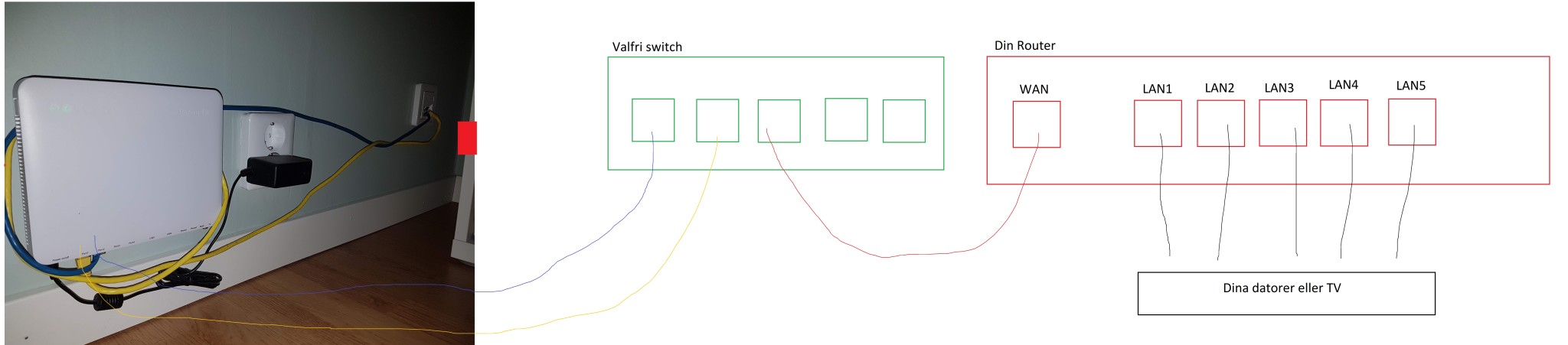 Kör du på lösningen med att sätta en switch så gör den enkelt sagt att du får två WAN portar till routern. Eftersom routern bara har en WAN port så behövs switchen.G MrGlad8 skrev:Ah ok, men va gör switchen i sig? Är nog dåligt påläst på switchar. För jag vill ju helst ha routern i mitt patchrum och inte här i sovrummet. Och måste jag då ha switchen? Jag har ju gått och trott att IP TV måste ha helt separat matning. Behöver den inte det, då kan jag ju skippa en kabel mellan fiberkonventerare och patchrum och bara köra den matningen som går till routern. Och sen från routen direkt till IP TV'n uttag?