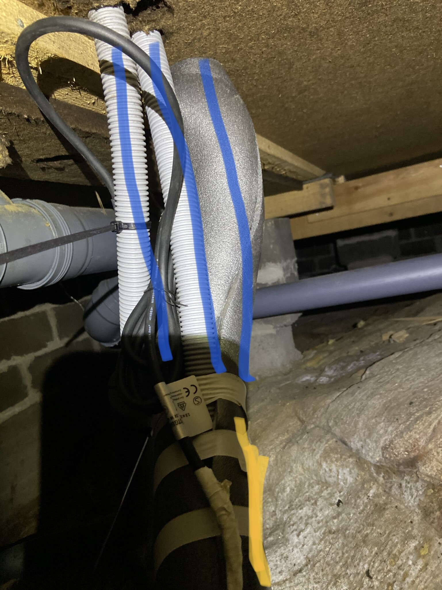 På bilderna: De blåmarkerade delarna av rören som är delvis exponerade (PEX med aluminium) befinner sig i krypgrunden under mitt hus och är inte uppvärmda. Där det är gulmarkerat, dvs innan och efter, finns värmekabel invid röret innanför isoleringen och i ena fallet löper röret upp till badrummet i huset som kommer ha 10 graders underhållsvärme vintertid.