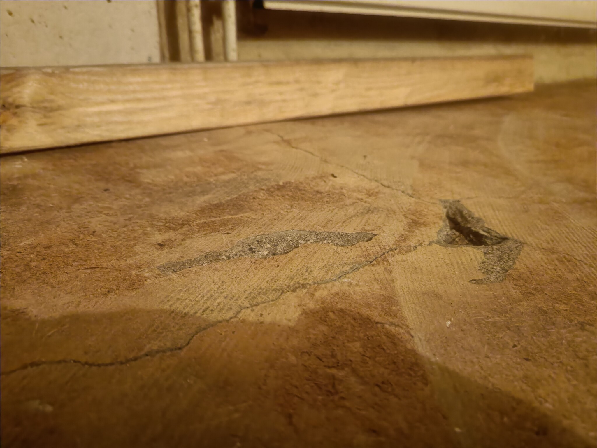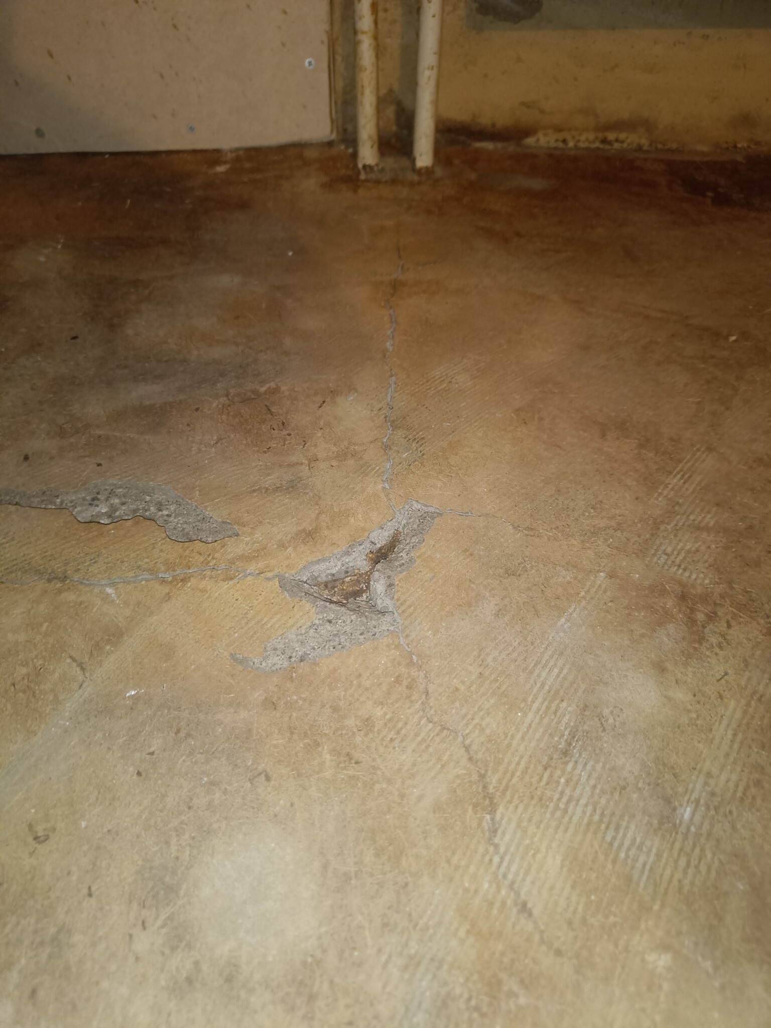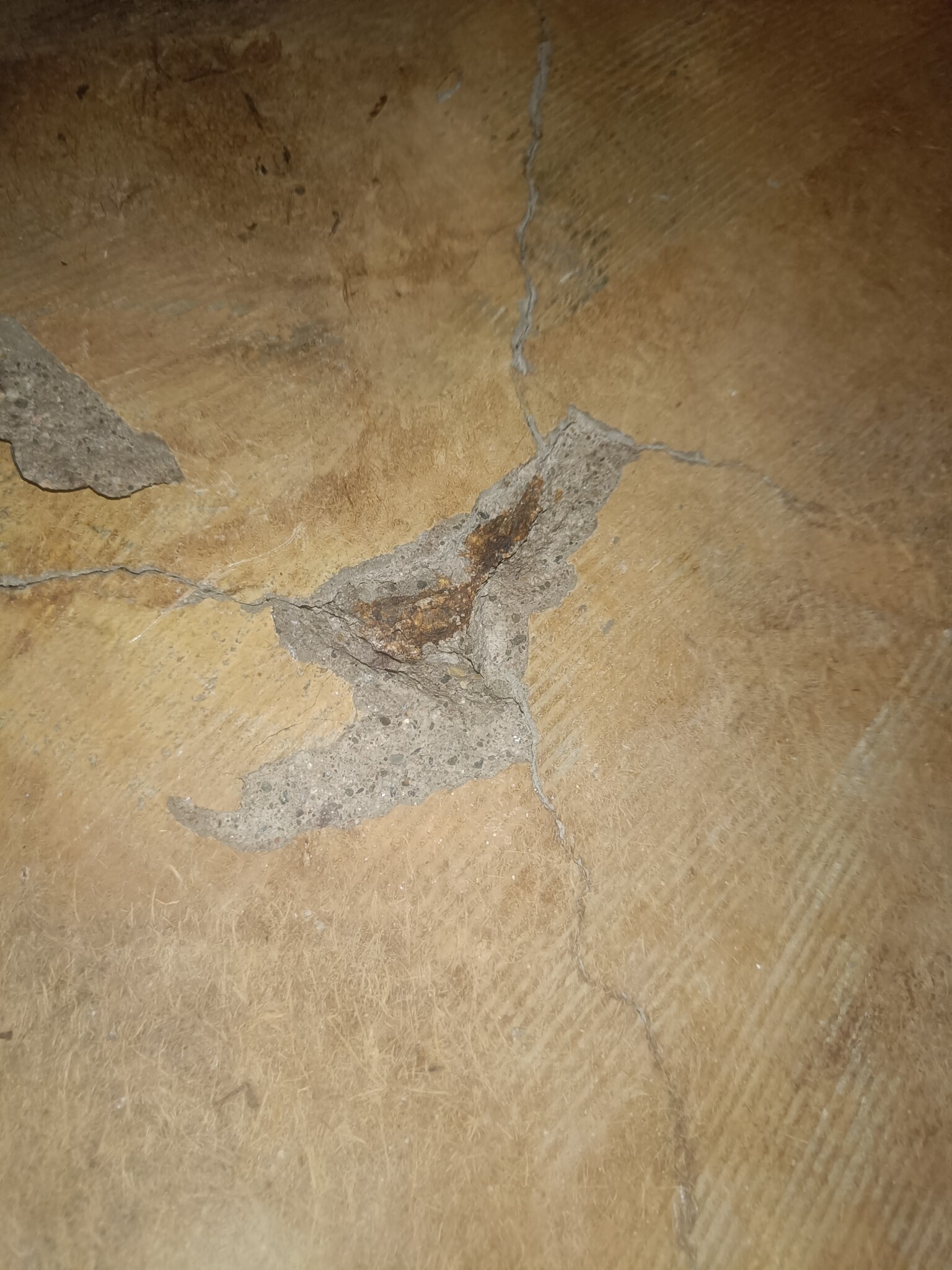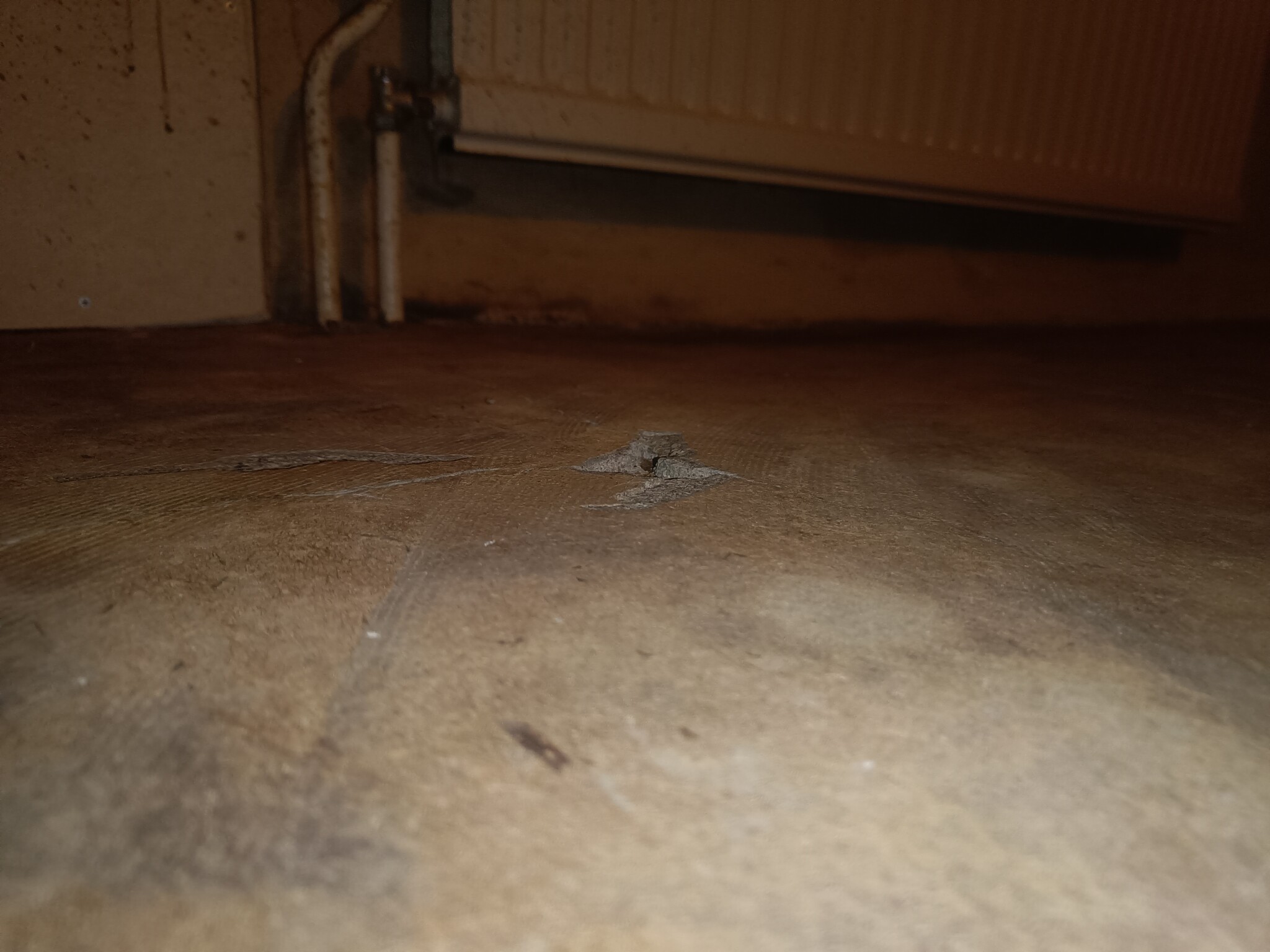 Men jag kan inte minnas sprickan på bilderna. Idag när jag äntligen rensade ut hela rummet från bös (haft rummet som förråd/verkstad) såg jag att det var en rejäl spricka och det har blivit konvext där radiatorrören går. Rimligtvis var sprickan där innan eftersom det inte var lösa betongbitar i sprickan här och var innan jag dammsög.