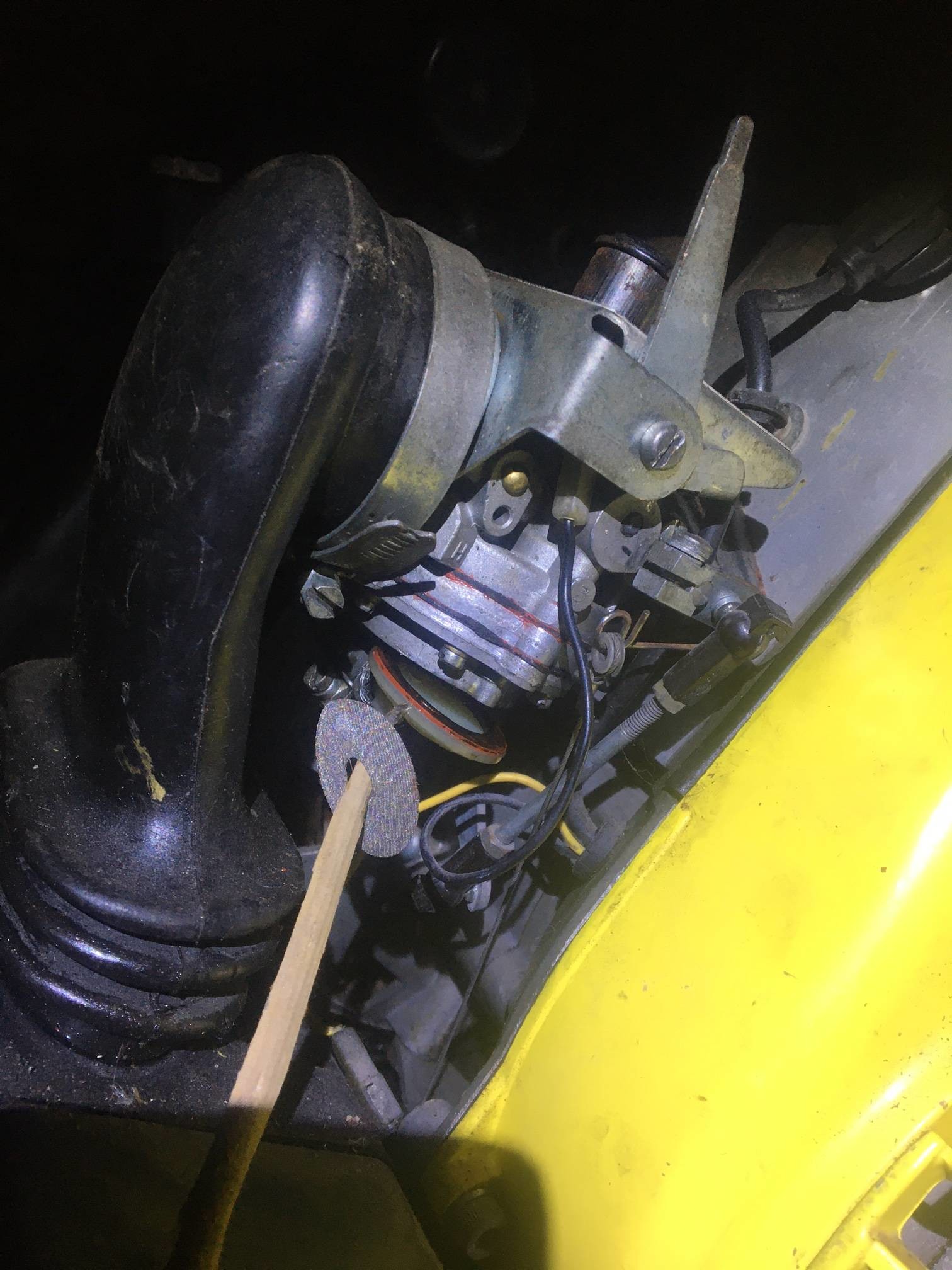 Du måste ta isär förgasaren för att komma åt membranen. Ser ut att bara vara ett filter du tagit loss. Sitter skruvar runtom för att fortsätta ta isär så du kommer åt dom. Byt när du liks tar loss (beställ först, ser som sagt ut att vara en Tillotson förgasare). Startar den om du ger den en skvätt direkt in genom förgasaren?