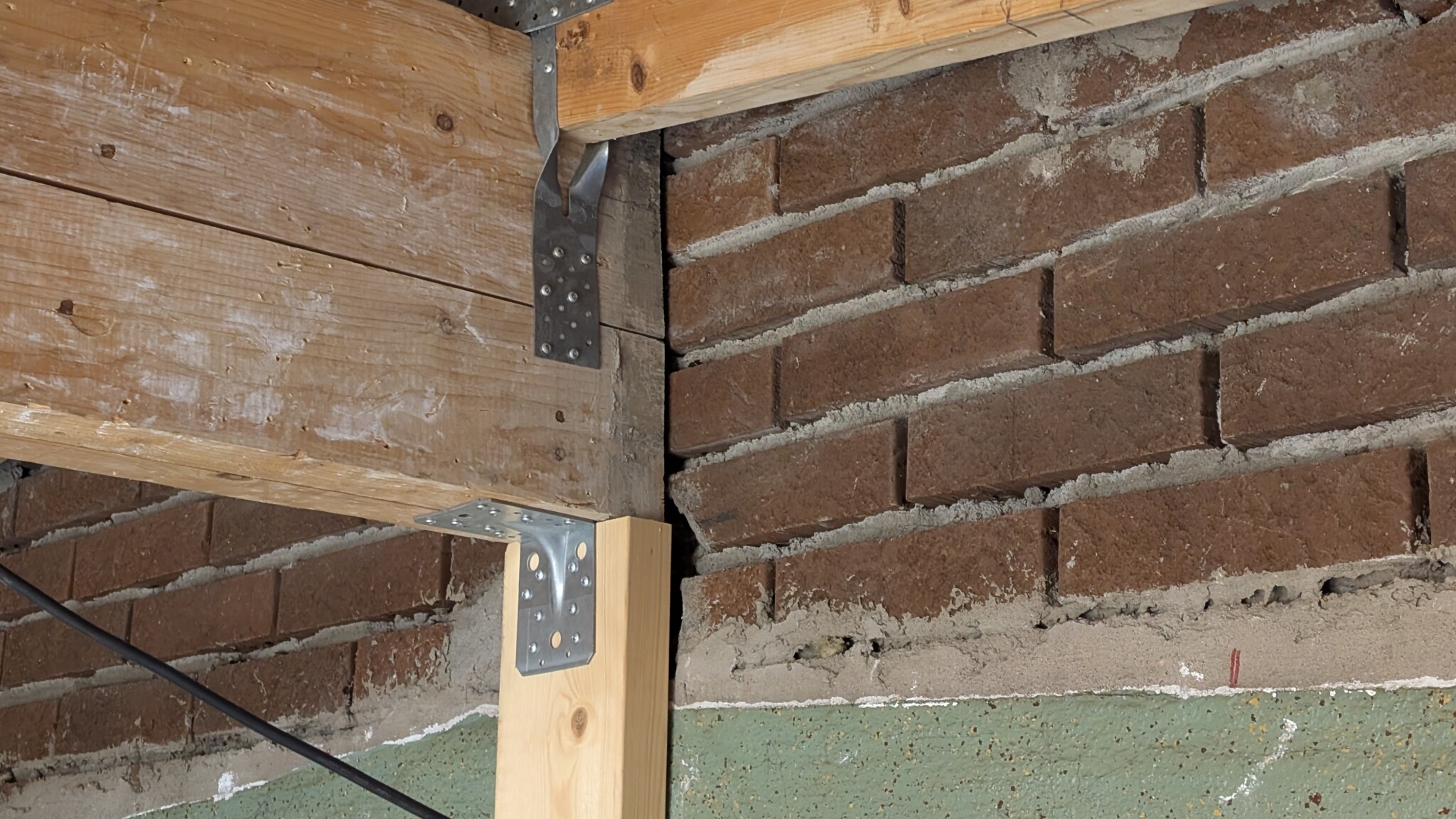 Taket har blivit höjt och balken vilade då ca 40-50mm in på teglet, detta känns inte så super stabilt.