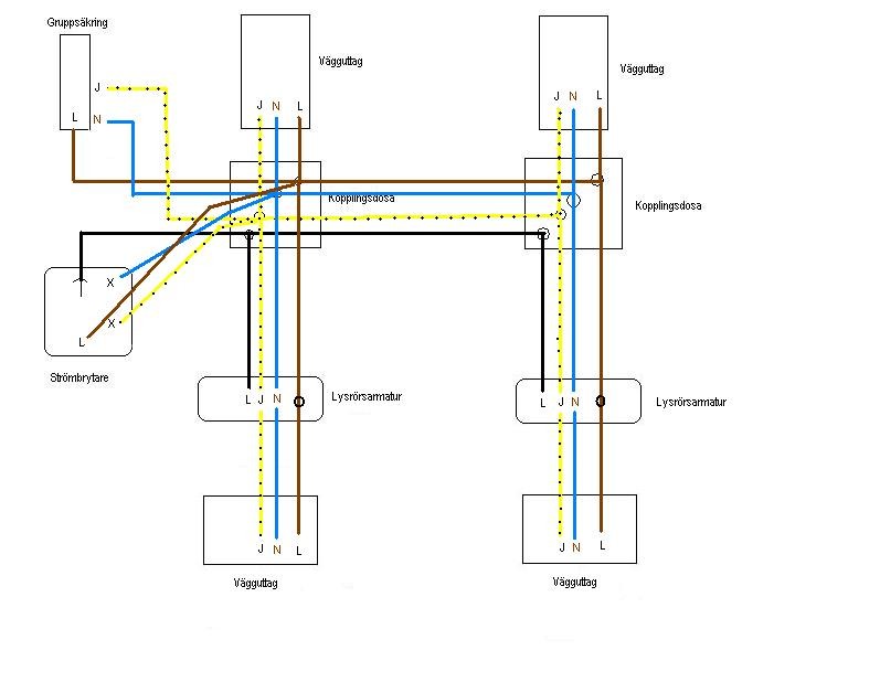 Jag har nu satt upp två väggar så det blivit ett rum och vill komplettera med två lysrörsarmaturer och en strömbrytare och vill stämma av så jag tänkt rätt här: