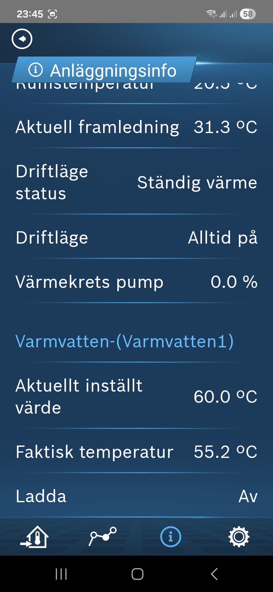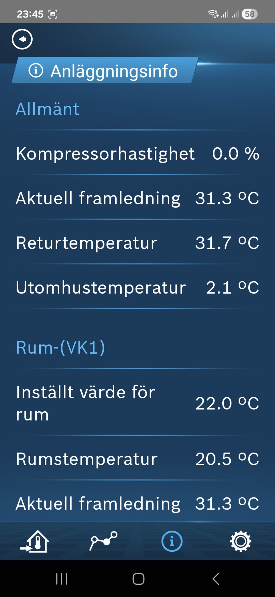Värmen i huset funkar. Men, när jag kollar i appen så går ej kompressorn. Den står alltid på 0%.