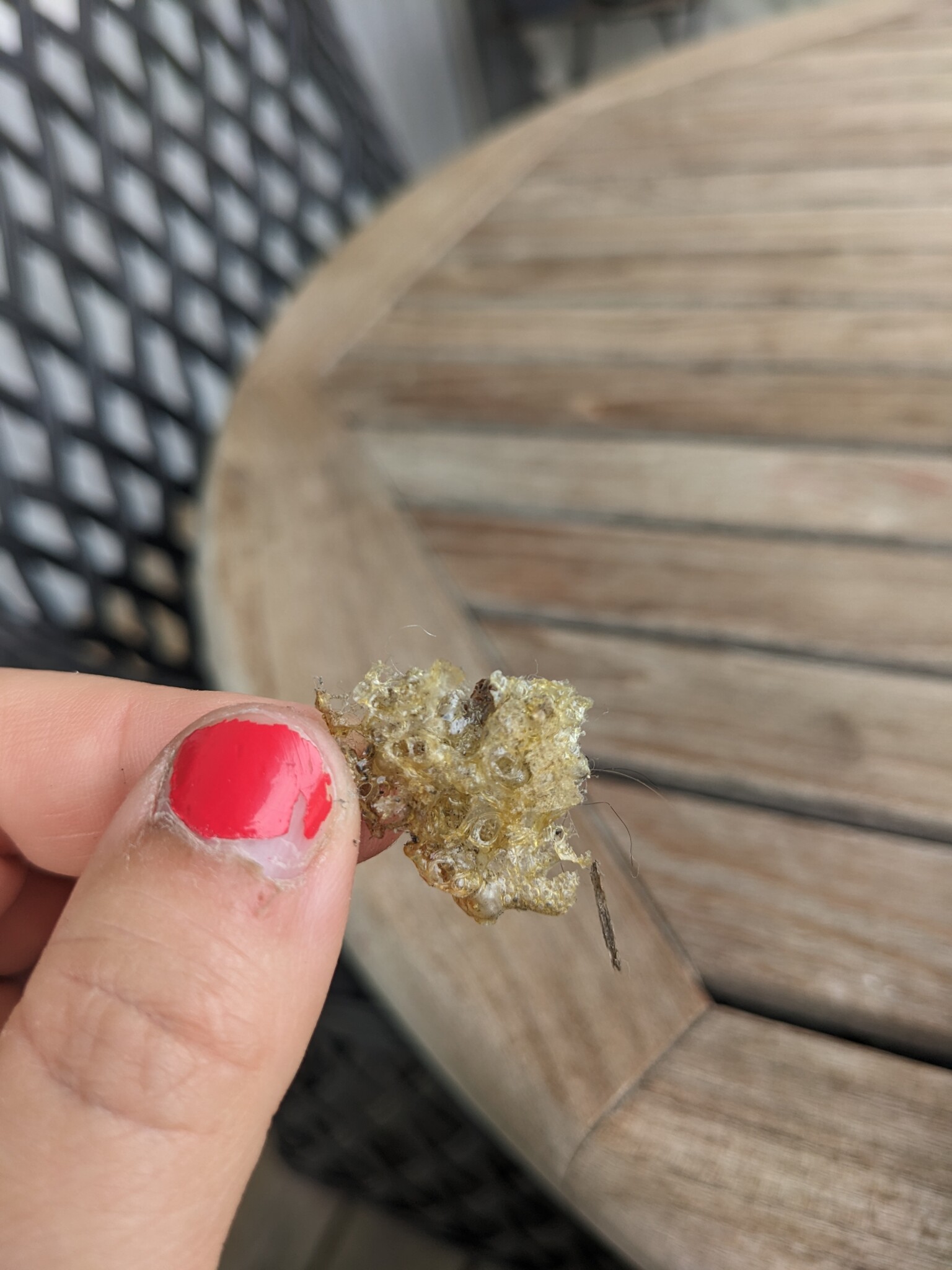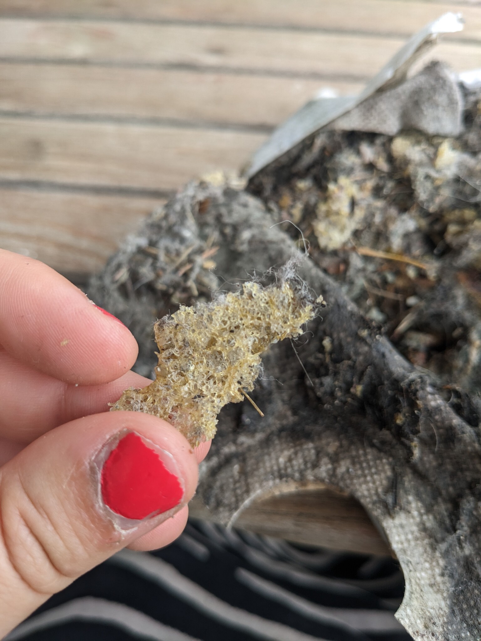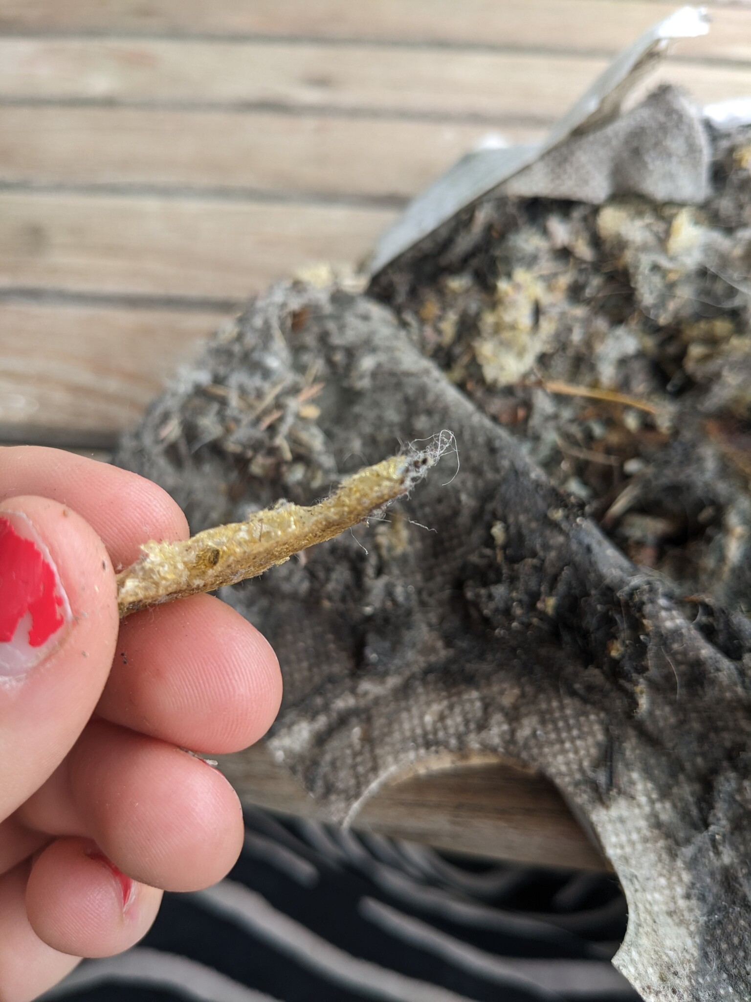 Klippte upp dammsugarpåsen för att se om det var nåt särskilt som sugits ut förutom vatten. Hittade dessa som jag inte kan tänka mig kommer från annat ställe än kondensslangen. Vet inte vad det kan vara. Funderade på torkad isolering, men det vore ju inte så bra isf.