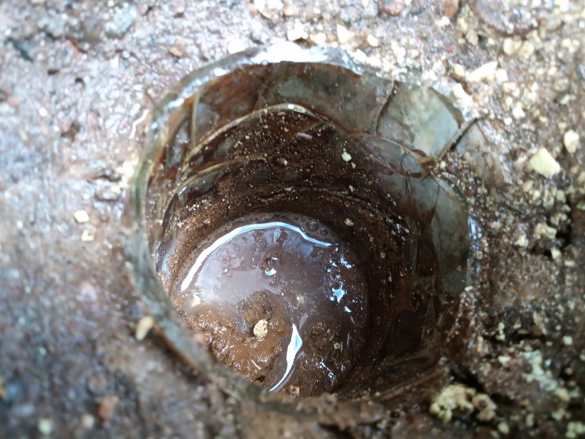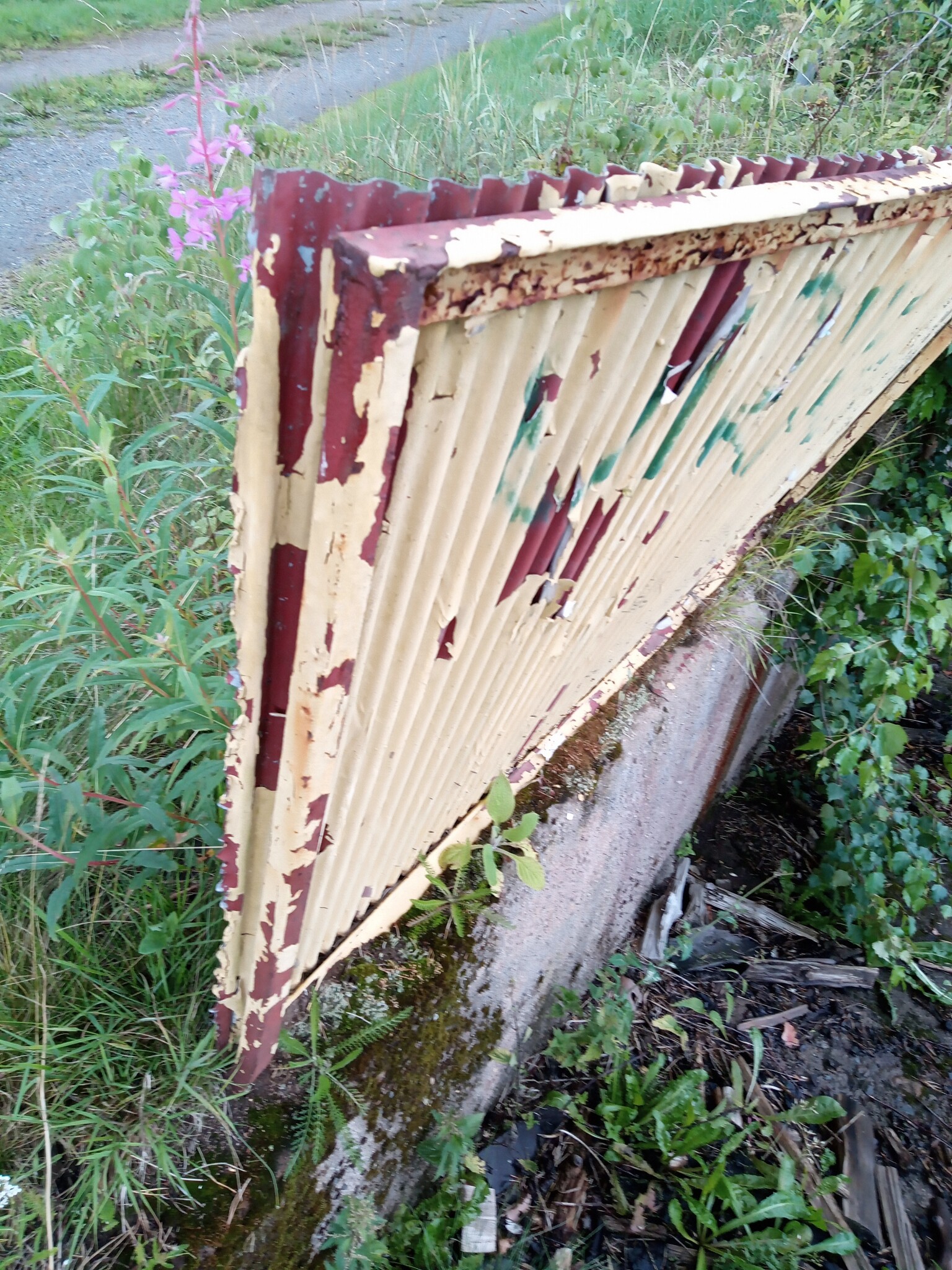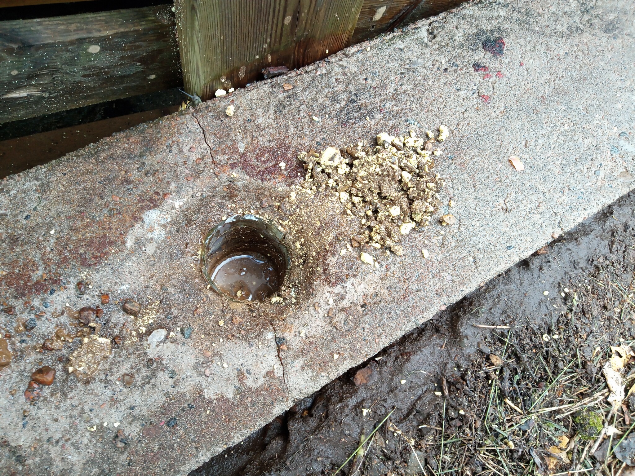 När jag högtryckstvättade toppen på muren inför påmurande av lecablock så uppenbarade det sig att de fastgjutna (och nu avrostade) räckesstolparna satt i glasrör med något klargult stenartat material (hade jag bara sett det gula hade jag tänkt svavel)