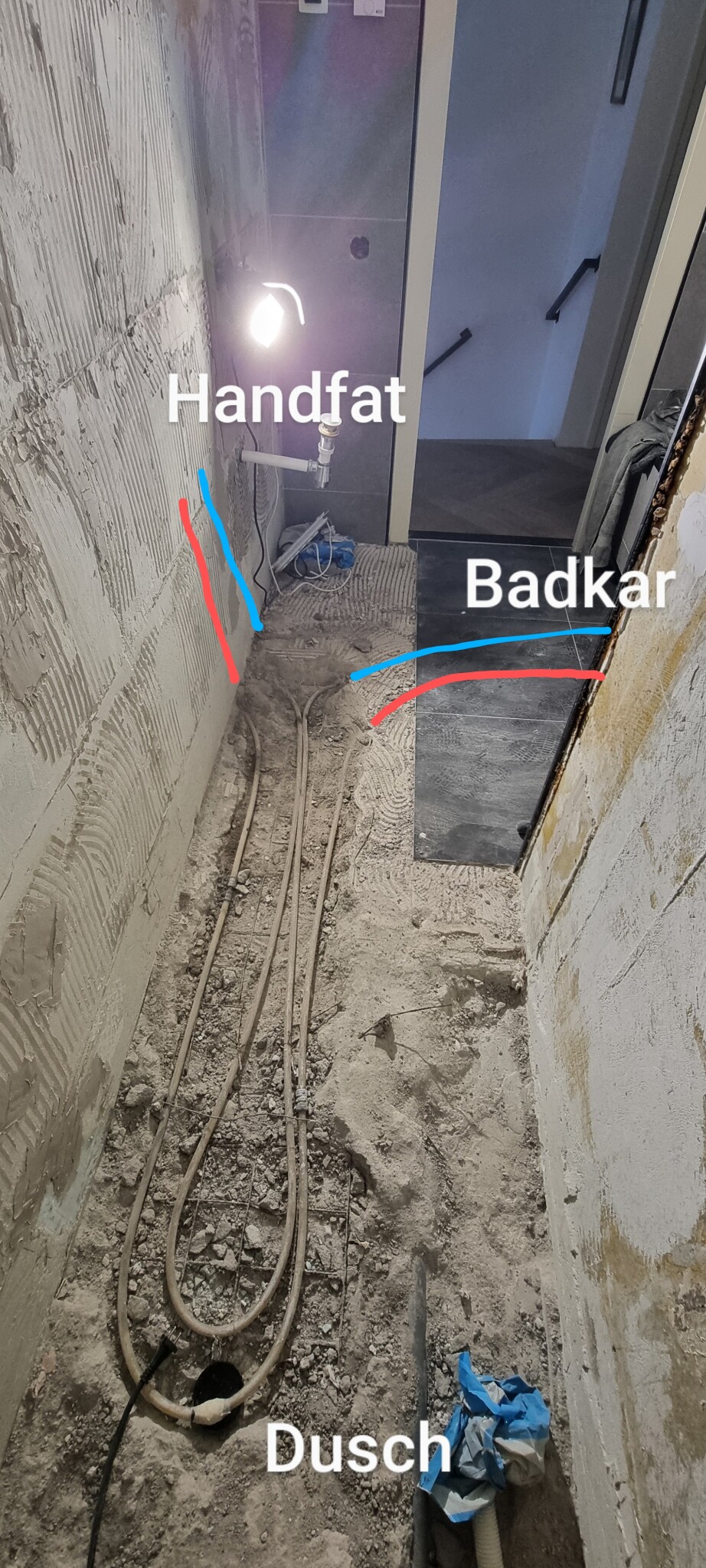 Nu till problemet. Jag råkade förstöra ett PEX-rör när jag plockade bort betong i duschen. Hade inte räknat med att det fanns rör i duschgolvet förutom avloppet då. Så med andra ord blev jag tvungen att frilägga röret helt men då märkte jag att den inte har med duschen att göra utan den går från handfat till badkar fast en lång omväg. Dessutom har dom skarvat det (ajjabajja) så det verkar ju vara gjort med flit. Varför ? Vad är poängen med att dra den så långt ?
