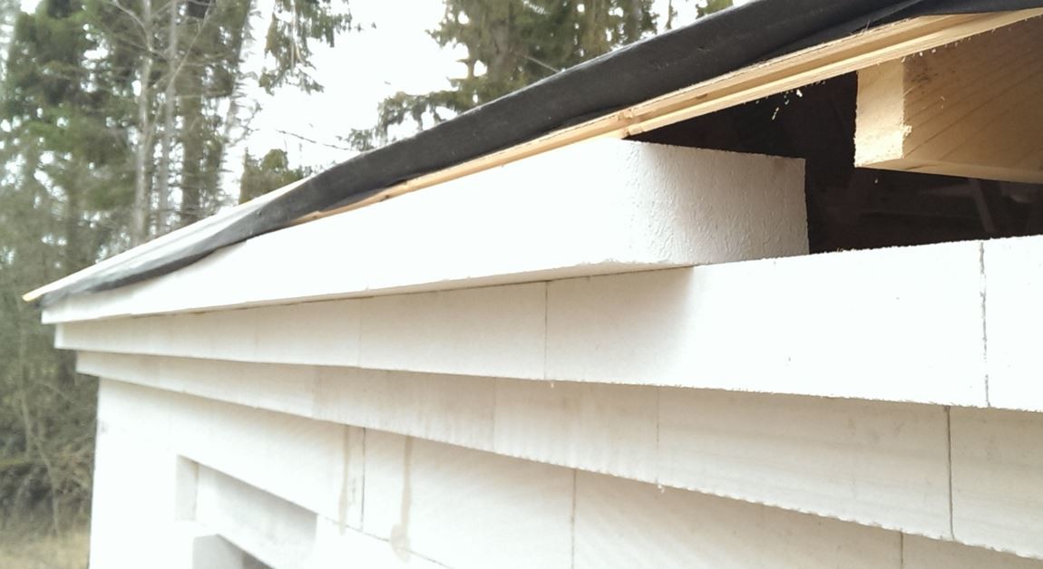 Jag bygger ett hus i lättbetong (Ytong) och har valt att sätta gesims vid takfoten (trappstegsliknande utsmyckning). De två understa är i lättbetong och ditmurade. Den översta måste jag konstruera av något trävirke. Dels för att det ska vara en luftspalt på vissa ställen och dels för att jag ska skruva hängrännan i den. Tanken är att alla tre ska vara slätputsade när det är klart (vitmålade).