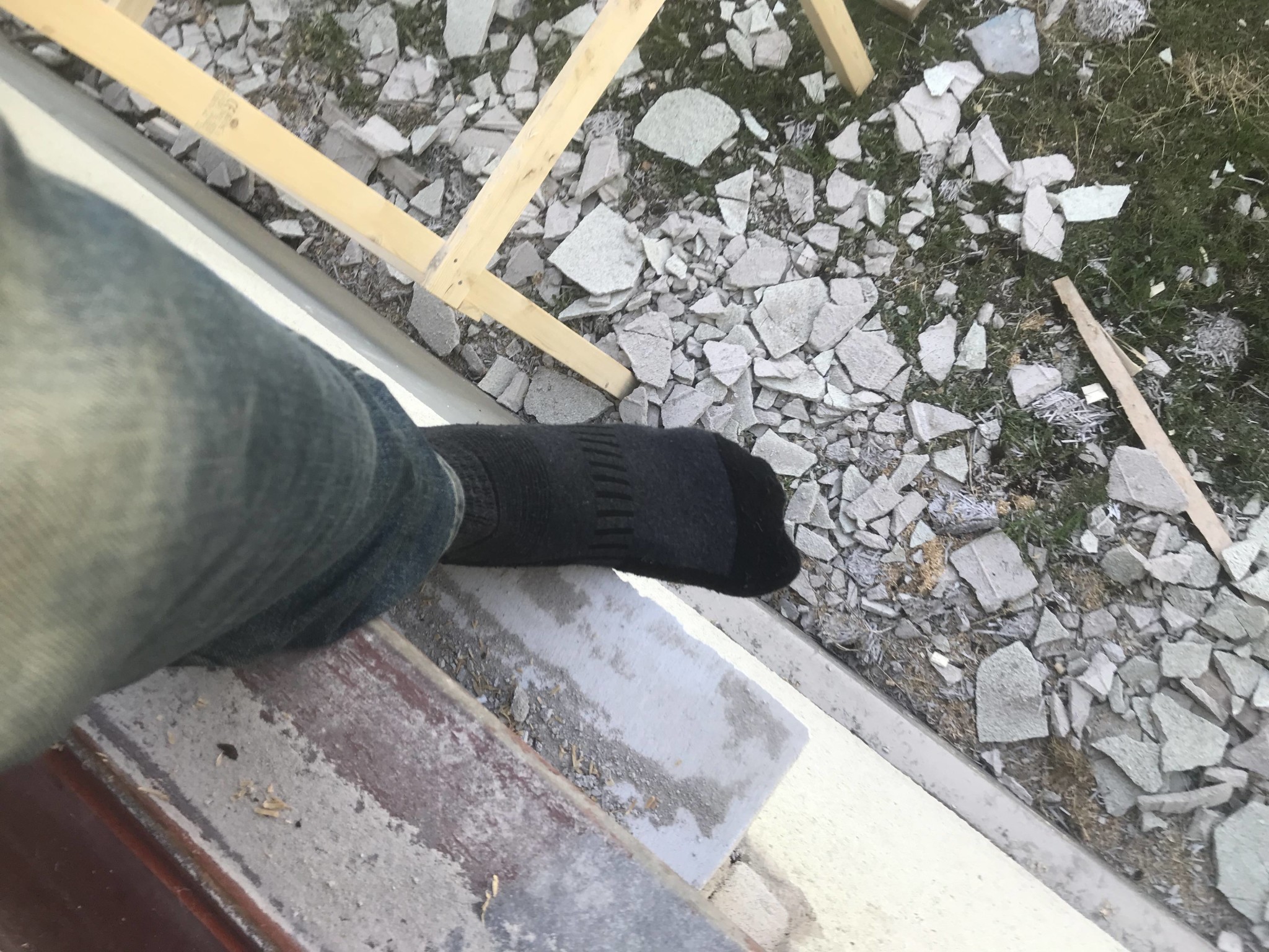 Drog bruk på en sten, och smällde fast på väggen stöttad av två putshakar, lät det stå ett dygn. Hamrade lite försiktigt, hamrade lite hårdare - slog så att stenen sprack. Nedan är en bild där jag med lite över 100 kilo står på stenen. - tunnfogsbruk är tydligen starkt.