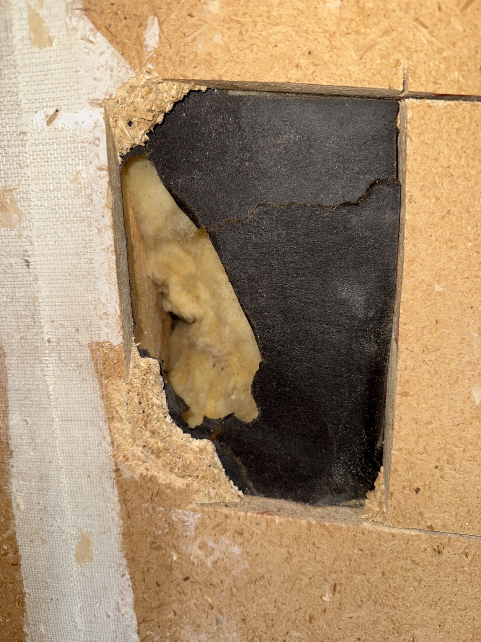 Vi har nyligen köpt ett hus från -71. Vi misstänker att det är ”hemmasnickrat”, men inga större ”fel” i konstruktionen vad vi kan se. Däremot öppnade vi upp en vägg (yttervägg) inifrån för att se hur det såg ut. Från yttre sidan hittar vi panel, asfaltsboard (vindskydd), glasfiber isolering, och därefter något papp - som inte ser helt rätt ut. Verkar mer vara något takpapp? Pappen har även ”färgat av sig” på MDF skivan som sitter allra ytterst mot insidan av väggen. Vad kan det vara? Det är väl ingen korrekt ångspärr/fuktspärr?