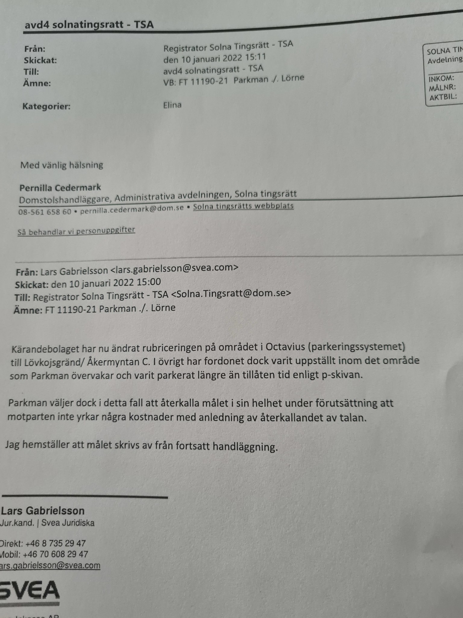 Dom drar tillbaka sin stämningsansökan under förutsättning att du inte ställer krav på dom. Det är en vanlig skrivelse från P-bolagen när dom vet att dom inte kommer längre, för bevisen räcker inte. Allt för att inte få något baklänges krav. Det finns lagvrängare som ger gratis råd, Kontakta någon och ta upp det om du kan ställa något krav ekonomiskt på Parkman. Du har på fötterna nu genom att dom vill avskriva efter din inlaga till tingsrätten och det vet dom med all säkerhet. Dom har gjort en pudel och nu vill dom att du ska hoppa över allt, så dom inte ev kan få en ekonomisk bakläxa. Kostar inget att se vad som kan göras mot deras generalfel i det hela.P Peter Lörne skrev: