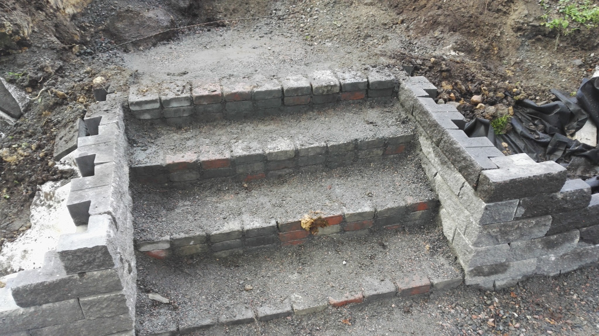 Så att vad ska jag foga min trapp, av marksten med, till stödmuren? Stenmjöl var ingen höjdare direkt.