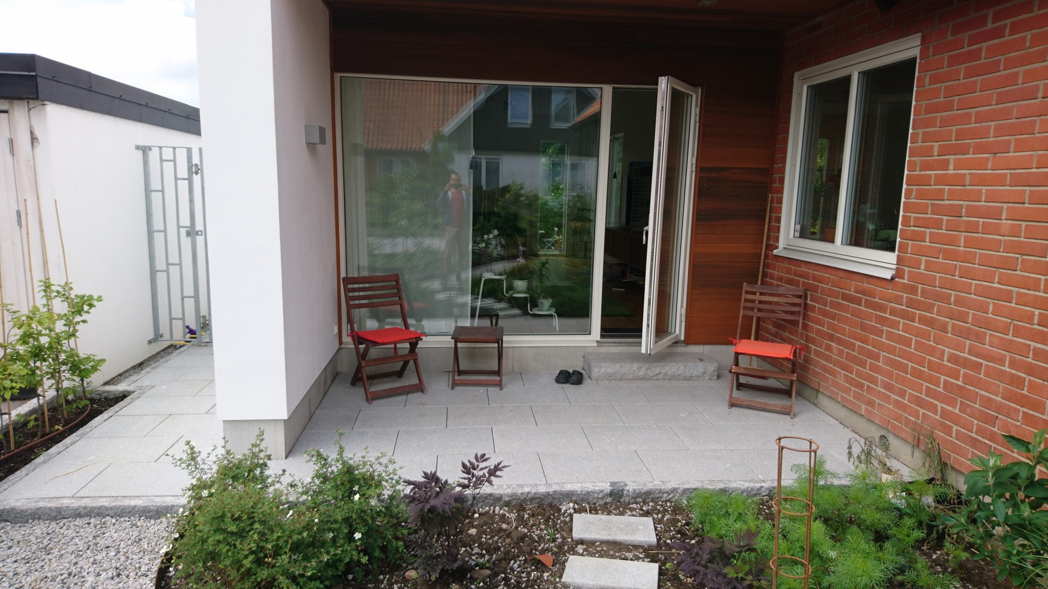 Här är en bild på mitt senaste stenprojekt. En upphöjd uteplats och gång av RV6 kantstöd och 60x40 hällar i granit. Under plattorna ligger ca 50 mm 2-4 makadam och under det ca 400-500 mm 8-11 makadam. 8-11 (samma som jag lade ut under grundplattan på bygget) fick bara stå och sätta sig lite med hjälp av regnet ett tag. Sen lade jag plattorna. Ligger stabilt som f*n.