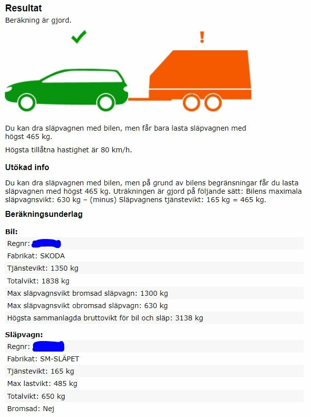 Släpvagnskalkylatorn stämmer bra således. Vilket kanske inte är så förvånande när det är Transportstyrelsens eget verktyg för oss som är osäkra. Men det är inte svårare än att det är fordonets tjänstevikt som styr vilken totalvikt släpet får ha och fortfarande dras i 80 km/h lastat, men det är bilens max dragvikt för obromsat släp som styr vad släpets bruttovikt får vara.