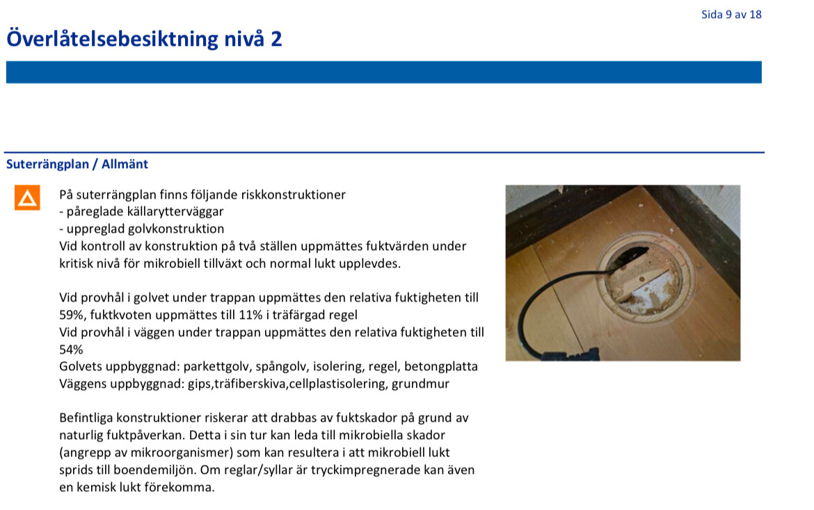 Vet inte om de som skrivit ögnat igenom protokollet. Det är inte som när vi köpte för 10 år sedan utan ganska flödigt med info. Bland det viktigaste för mig är att det är torrt i suterrängplan (golv och vägg) samt att råsponten inne på vinden ser fin och torr ut.